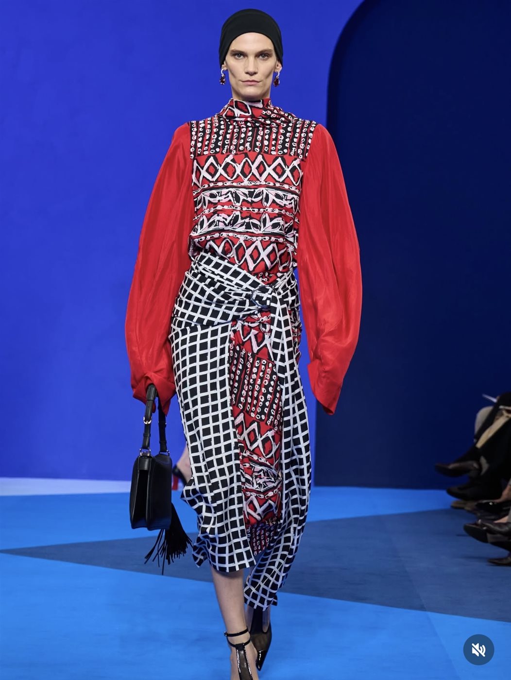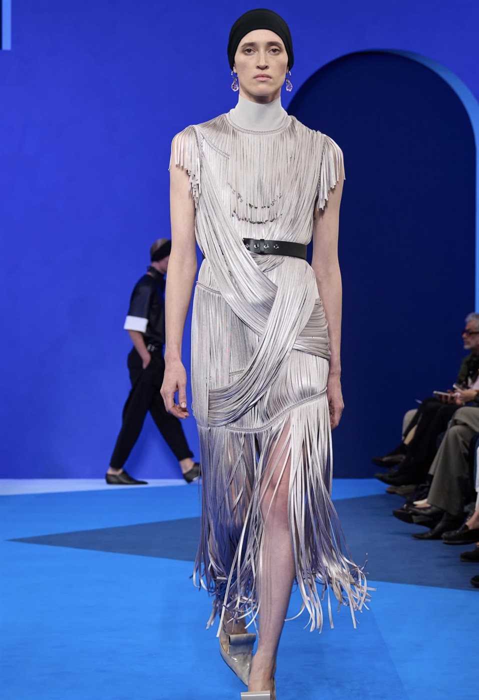 وفي قلب المجموعة، برزت الأكتاف البارزة كدلالة على الثبات والقوة، عودة إلى القصات الهيكلية التي تمنح الإطلالة حضورًا قويًّا وكأنما تتحدّى الزمان. كما أضفت الأوشحة المبتكرة لمسة درامية بين الأقمشة الشفافة والنسيج الكثيف، تغلّف الرقبة بحركات مرنة تُضفي على الإطلالات حيوية وتنوّعًا بصريًا. أما التنانير، فقد جاءت بأنماط متدرجة ومُقسّمة، تمنح الحركة والرقّة في آن واحد ، مع لمسات خفية من الطيات والتداخلات التي تُشبه أسلوبًا من الماضي مع تجديد عصري.