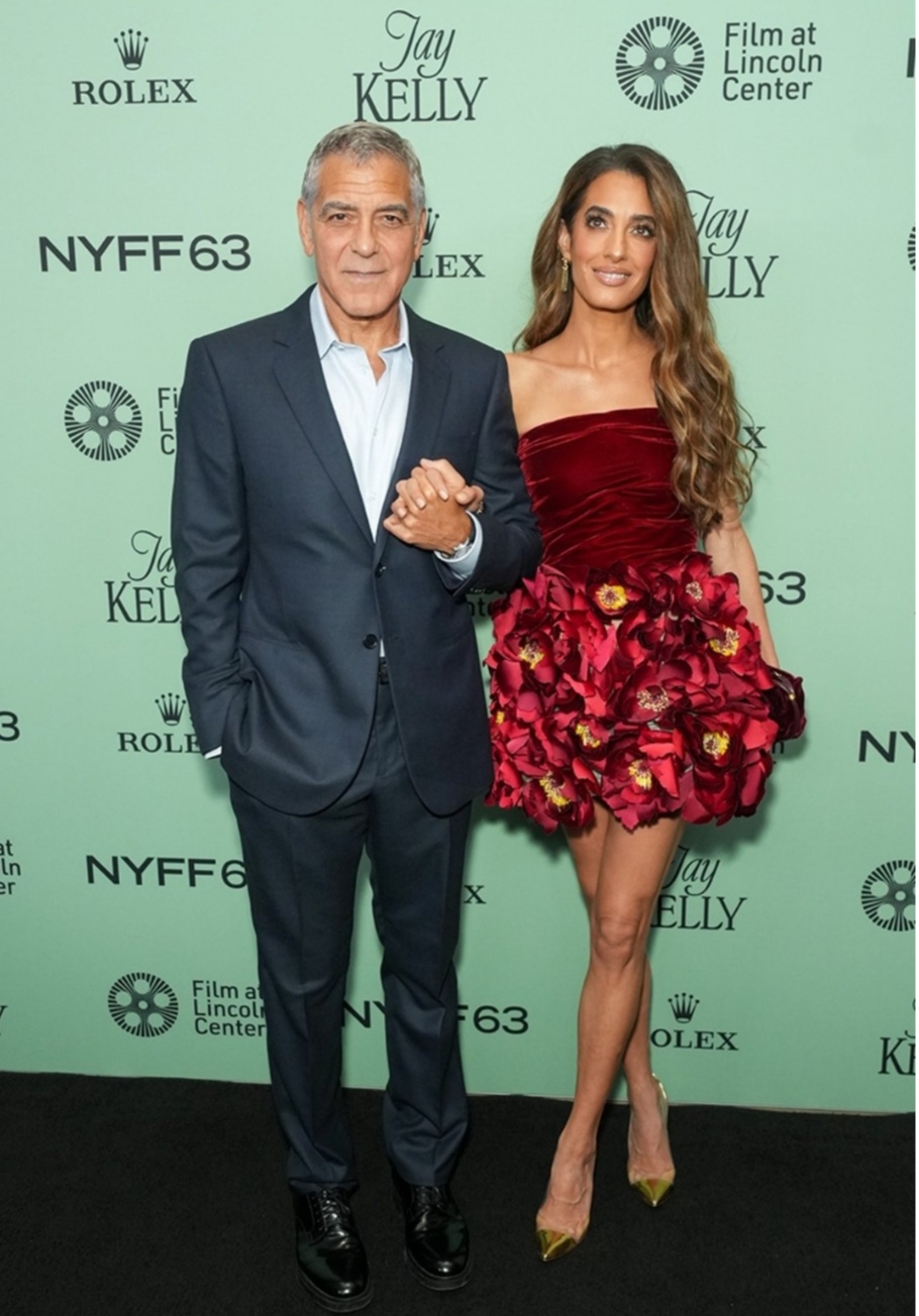 وقد رافقها زوجها النجم العالمي جورج كلوني، الذي بدا في غاية الأناقة، مرتديًا بدلة سوداء كلاسيكية
