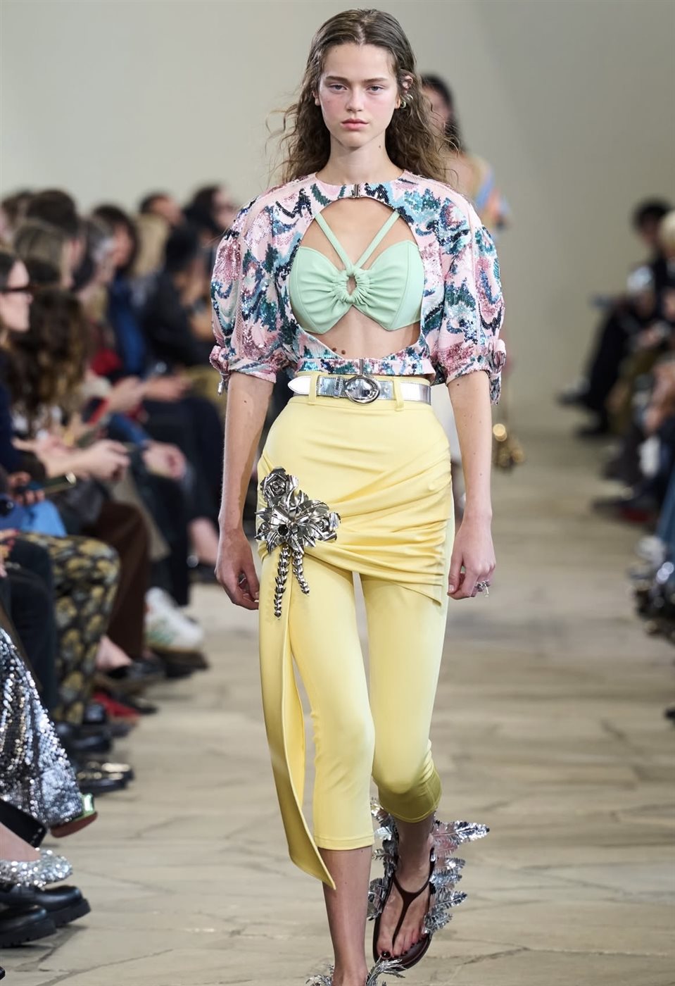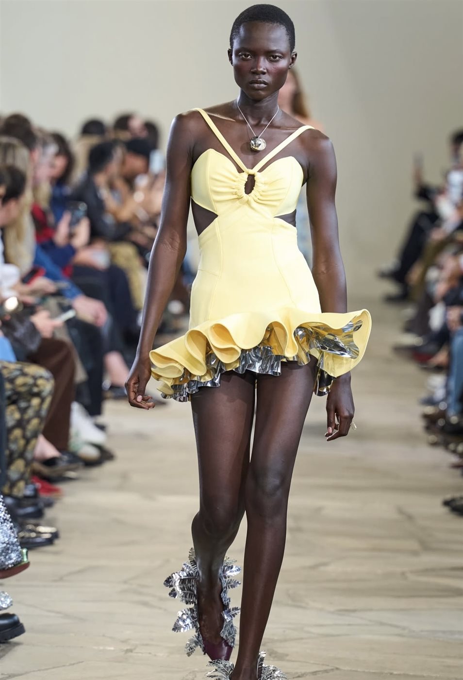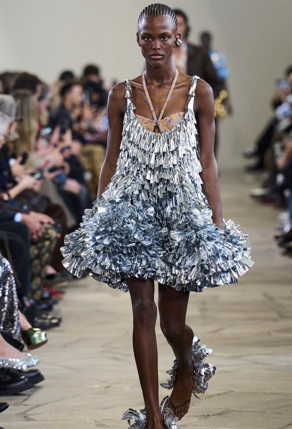 الألوان لعبت دورًا محوريًا في هذا العرض، إذ توزعت بين الذهبي والفضي البراق اللذين أضافا طابعًا مستقبليًا، والطبعات الاستوائية التي أدخلت الحياة إلى التصاميم، إلى جانب الشرائط الحيوية التي بثت الحركة في الأقمشة. بهذا المزيج، قدّم Rabanne رؤية متوازنة بين الجرأة والأناقة، وبين الانطلاق الحر والترف العصري.