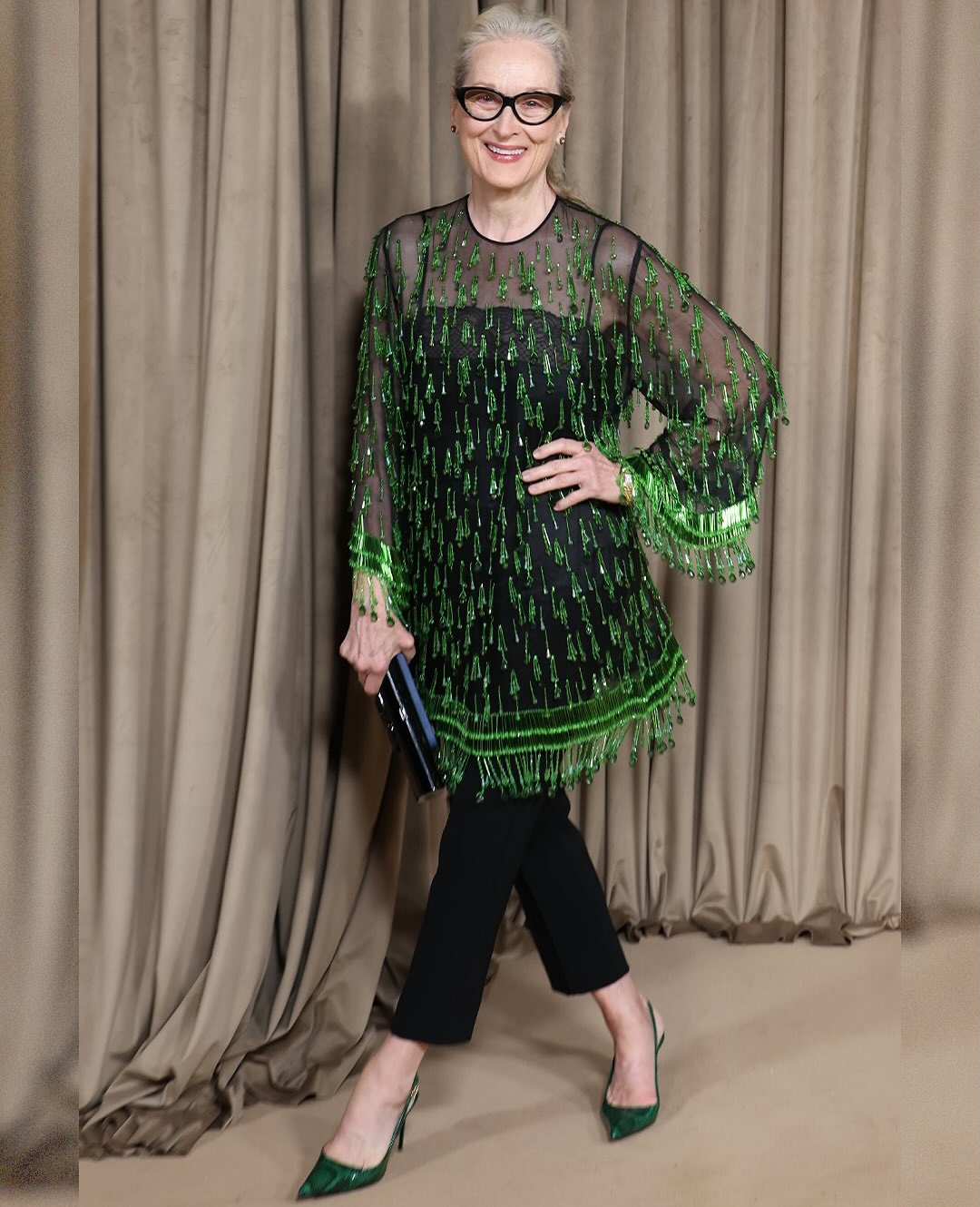 ظهرت ميريل ستريب، الحاصلة على ثلاث جوائز أوسكار وأكثر من 20 ترشيحًا، بإطلالة جمعت بين البساطة والرقي، مؤكدة مرة أخرى مكانتها كأيقونة للأناقة الهادئة والمميزة في عالم هوليوود وقد ارتدت ستريب بنطلونًا كلاسيكيًا باللون الأسود، نسّقته مع بلوزة طويلة من قماش الشيفون الأسود، مطرزة بتفاصيل دقيقة باللون الأخضر، مما أضفى على الإطلالة لمسة فنية أنيقة حيث جاءت الإطلالة بعيدة عن المبالغة و لكنها حملت الكثير من الذوق والاناقة
