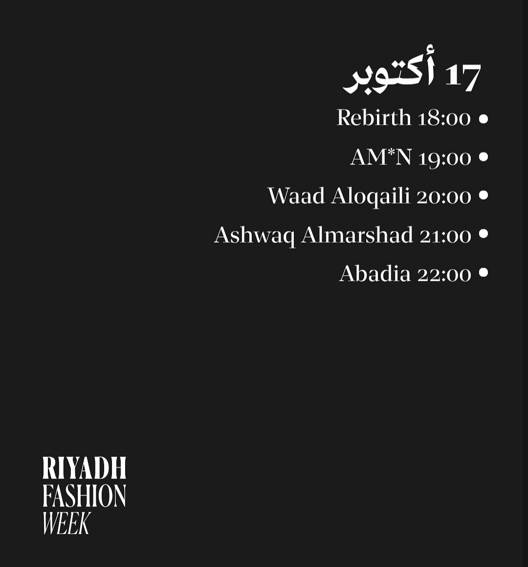 تتواصل العروض مع Rebirth عند الساعة 18:00، ليفسح المجال لاحقًا أمام AM*N وWaad Aloqaili، اللتين تبرزان توليفة فريدة من التراث والحس الحديث. وتواصل كل من Ashwaq Almarshad وAbadia تقديم رؤى تصميمية تحتفي بالاستدامة والهوية المحلية بأسلوب عالمي مميز.