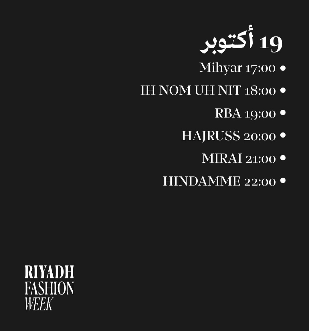 تبدأ العروض مع دار Mihyar، قبل أن تحل العلامة العالمية IH NOM UH NIT ضيفة على المنصة بعرض يمزج بين الفخامة والطابع الحضري العصري. وتستمر الفعالية مع RBA وHAJRUSS بعروض تحاكي الأصالة، لتختم كل من MIRAI وHINDAMME اليوم بتصاميم ذات بصمة سعودية عالمية.