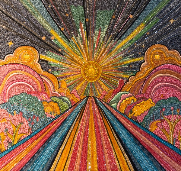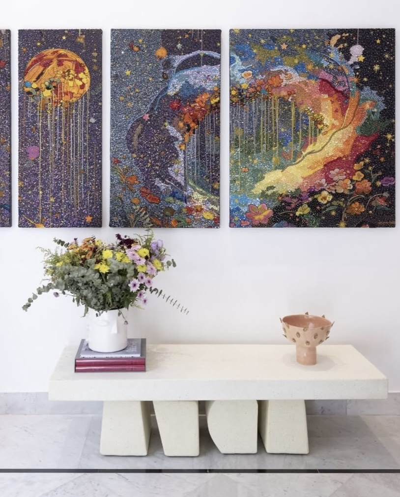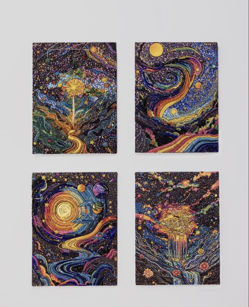ومن أبرز أعمال المعرض “The Four Seasons of Light” الذي يجسد دورة الضوء والحياة، ولوحة “Cosmic Waterfall” التي تتدفق فيها خيوط الخرز الزجاجي من اللوحة إلى الأرض في مشهد فني ساحر، إلى جانب عمل “Chromium” الذي يتكوّن من تسع ألواح لونية نابضة بالحياة تشكل مجرة متناغمة تعكس وحدة الضوء والطبيعة.