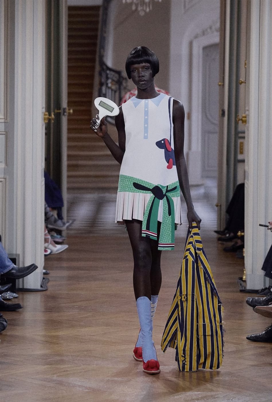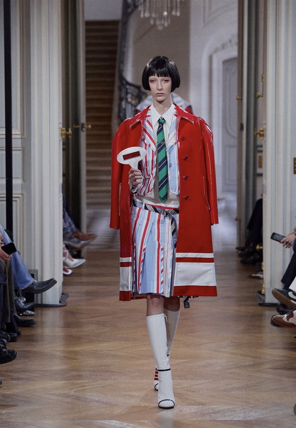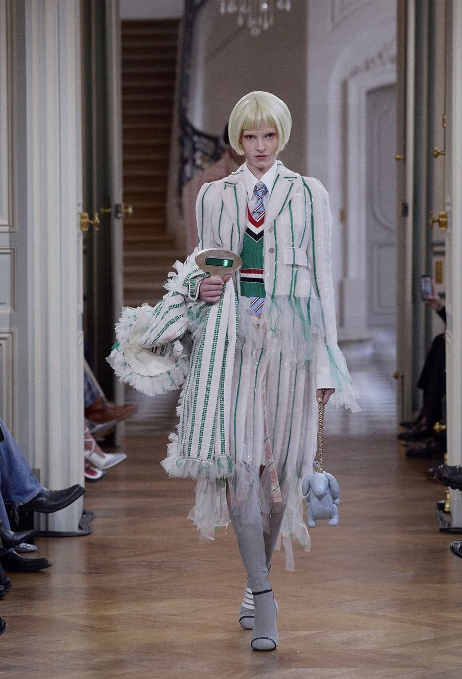 قدّم المصمم الأميركي Thom Browne مجموعة ربيع 2026 في عرض باريسي تحول إلى مشهد سينمائي يخطف الأنظار ، حيث امتزجت هوية الدار الكلاسيكية المستوحاة من زي المدارس الأمريكية مع رؤية مستقبلية صريحة تكاد تُحاكي هبوط كائنات فضائية على المدرج. ارتكز العرض على سرد مسرحي سريالي جعل كل قطعة تبدو كقطعة من عالم آخر من بدلات التويد التقليدية إلى تنانير مطرزة وأذرع إضافية وزينة لامعة توحي بأن التصاميم صُمِّمت لأجسام ليست بشرية بالضرورة.