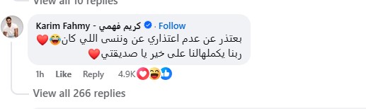 ولكن خرج الفنان كريم فهمي عن صمته ليعلن بشكل رسمي تعاونه مع ياسمين عبدالعزيز في مسلسلها الجديد، قائلا: “بعتذر عن عدم اعتذاري عن وننسى اللي كان، ربنا يكملهالنا على خير يا صديقتي”.