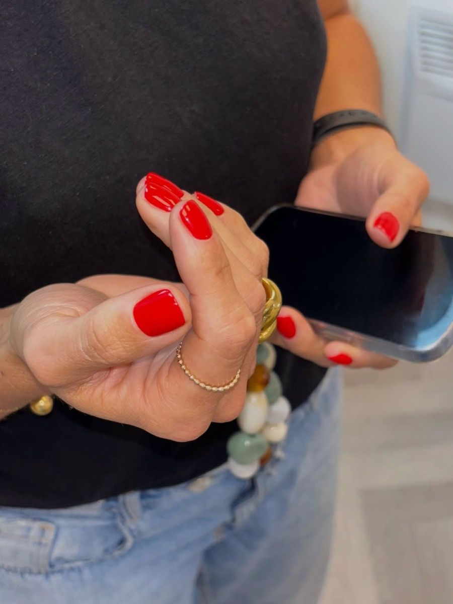 - الأحمر الغامق بدرجاته القرمزية أو العنابية، رمز الأنوثة والقوة، وهو مثالي للأظافر اللوزية متوسطة الطول.