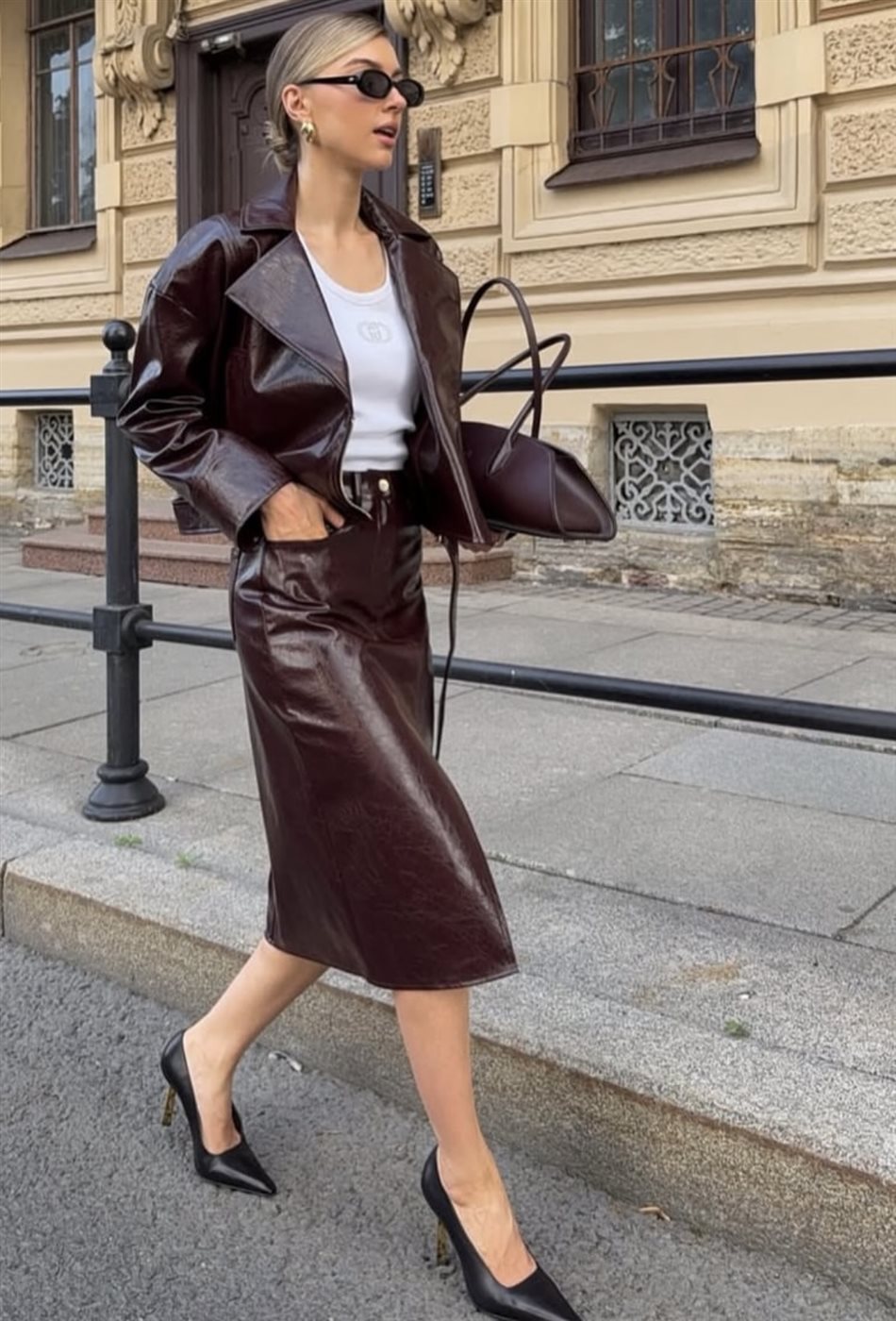 فالتنورة الجلدية تمنح من ترتديها مزيجاً من الثقة والجرأة والرقيّ، وتُعد خياراً مثالياً للانتقال من إطلالة نهارية مريحة إلى أخرى مسائية أنيقة دون عناء. يمكن تنسيقها بعدّة طرق، منها اعتمادها مع تيشيرت قطنية بيضاء وحذاء رياضي لإطلالة كاجوال أنيقة، أو مع قميص حريري وبوت طويل لإطلالة أكثر فخامة تناسب عشاء المساء، بينما تمنحها السترة الجلدية أو البليزر البنّي أو الرمادي لمسة من القوة العصرية التي تعكس شخصية واثقة ومتحرّرة.