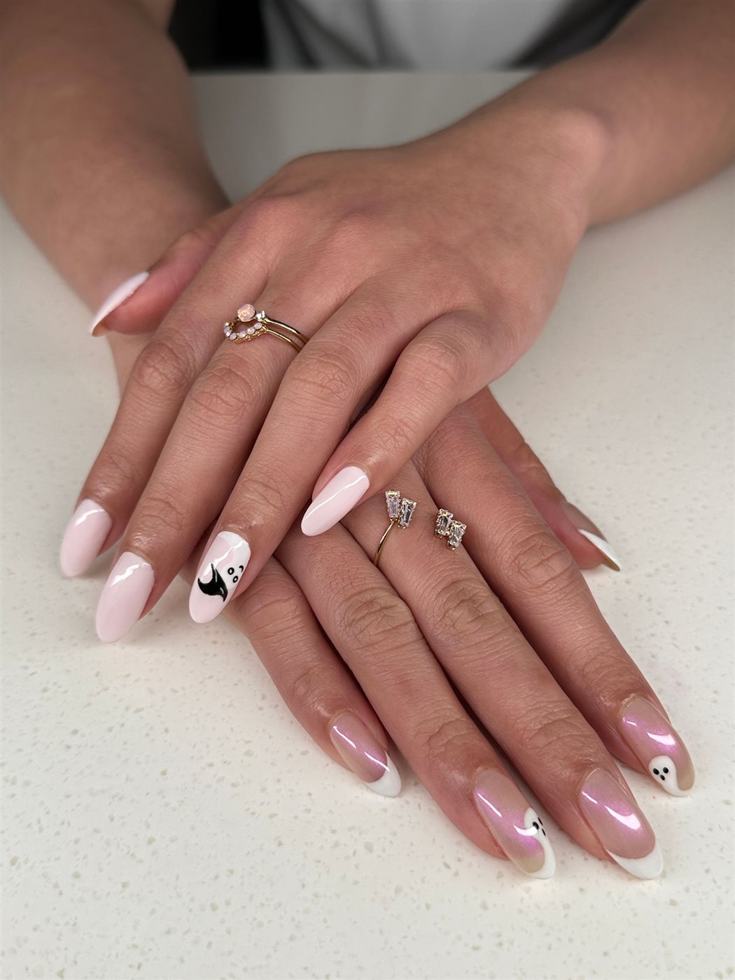 بدلاً من الأطراف البيضاء الكلاسيكية، جربي تحويلها إلى أشباح صغيرة مرسومة بخفة على قاعدة شفافة أو لؤلؤية.