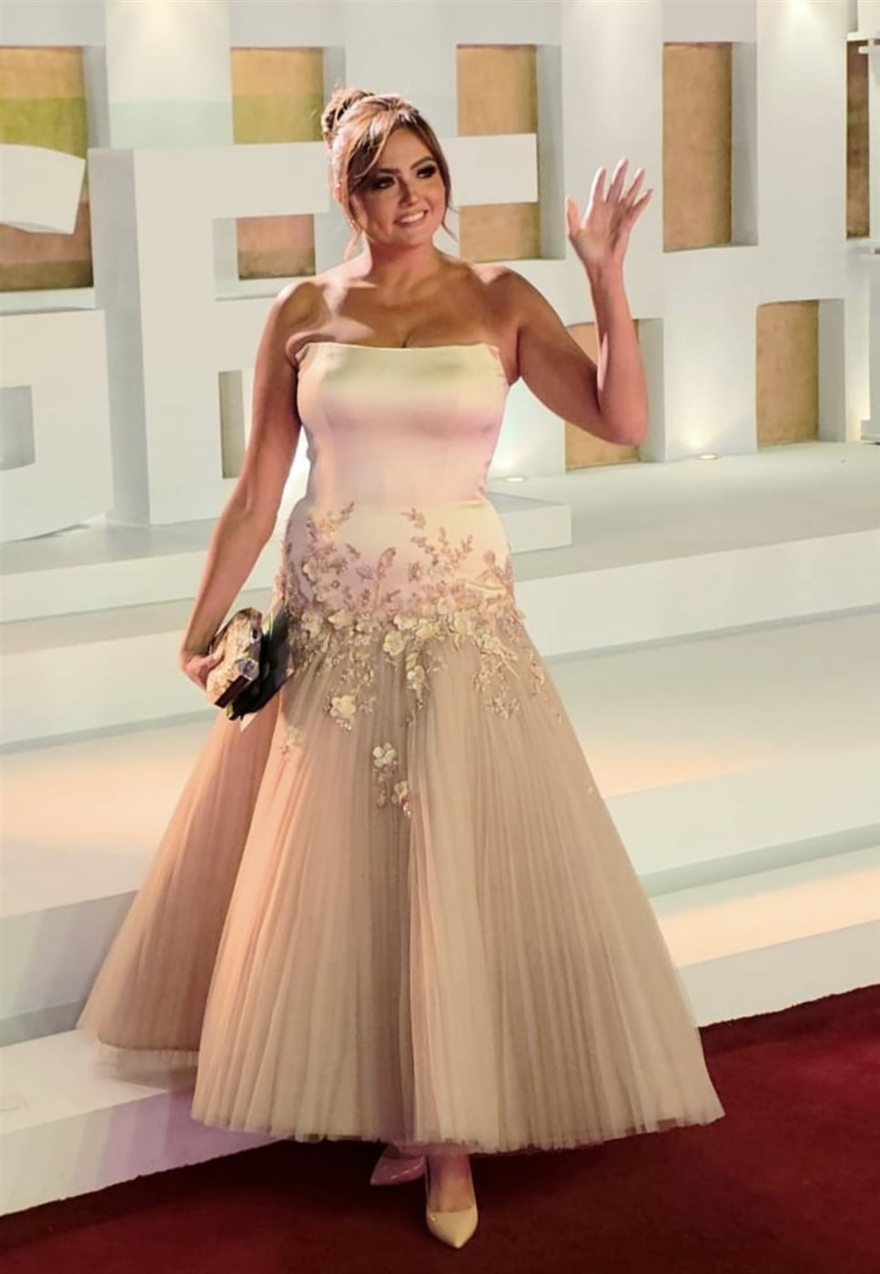 إطلالة أنثوية ناعمة: بشرى تتوهّج على السجادة الحمراء في مهرجان الجونة السينمائي
