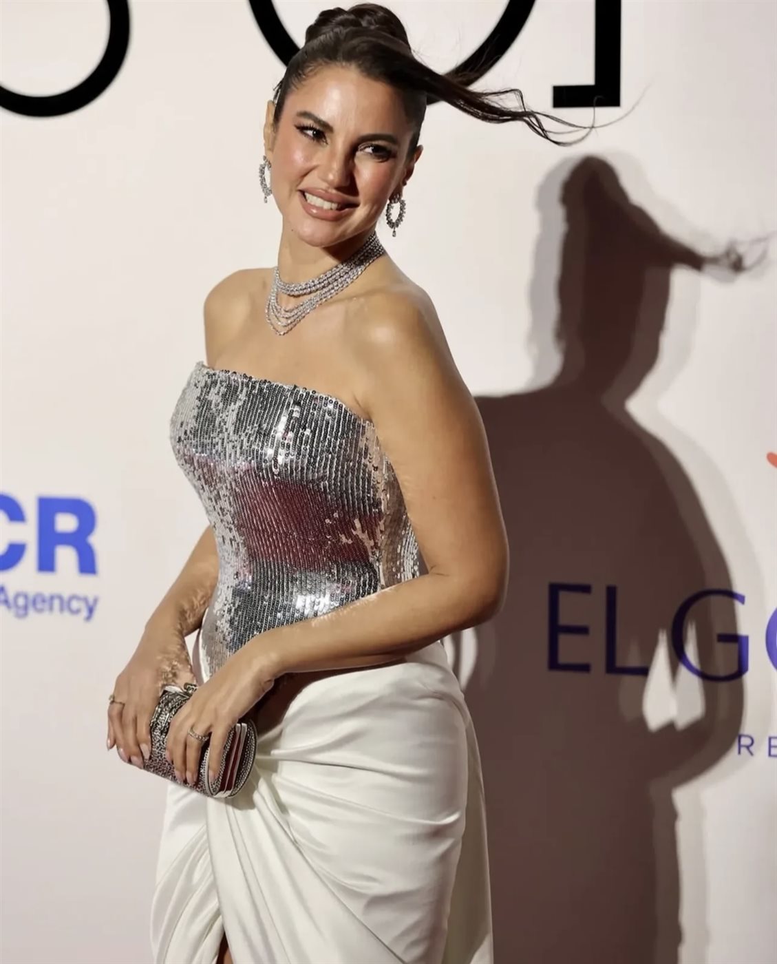 ظهرت درة بفستانٍ لافت التصميم يجمع بين الجزء العلوي المعدني اللامع باللون الفضي والمطرّز بالكامل بحبيبات براقة من الترتر تعكس الضوء بطريقة تخطف الأنظار، وبين جزءٍ سفليّ من قماش الساتان الأبيض الناعم بتصميم draped (متدلٍ) ينساب بانسيابية حول القوام، ما أضفى لمسة من النعومة والتوازن على البريق المعدني. هذا التباين بين الأقمشة والألوان منح الإطلالة مزيجًا متناغمًا من القوة والأنوثة في آنٍ واحد.