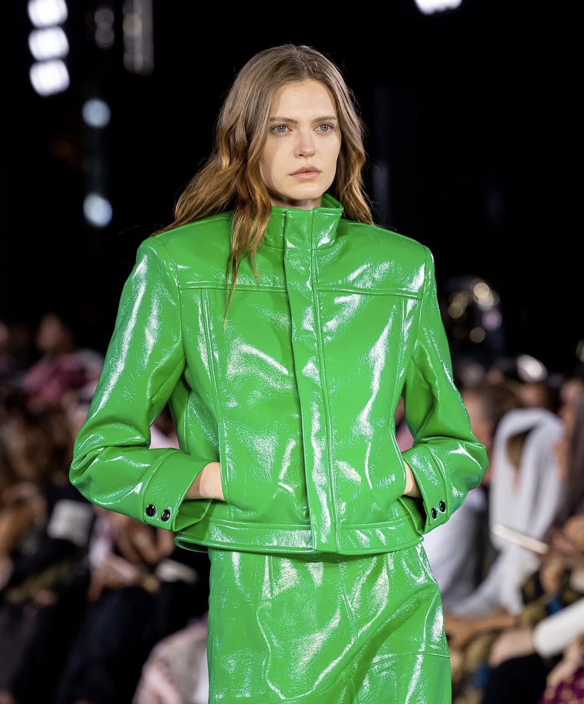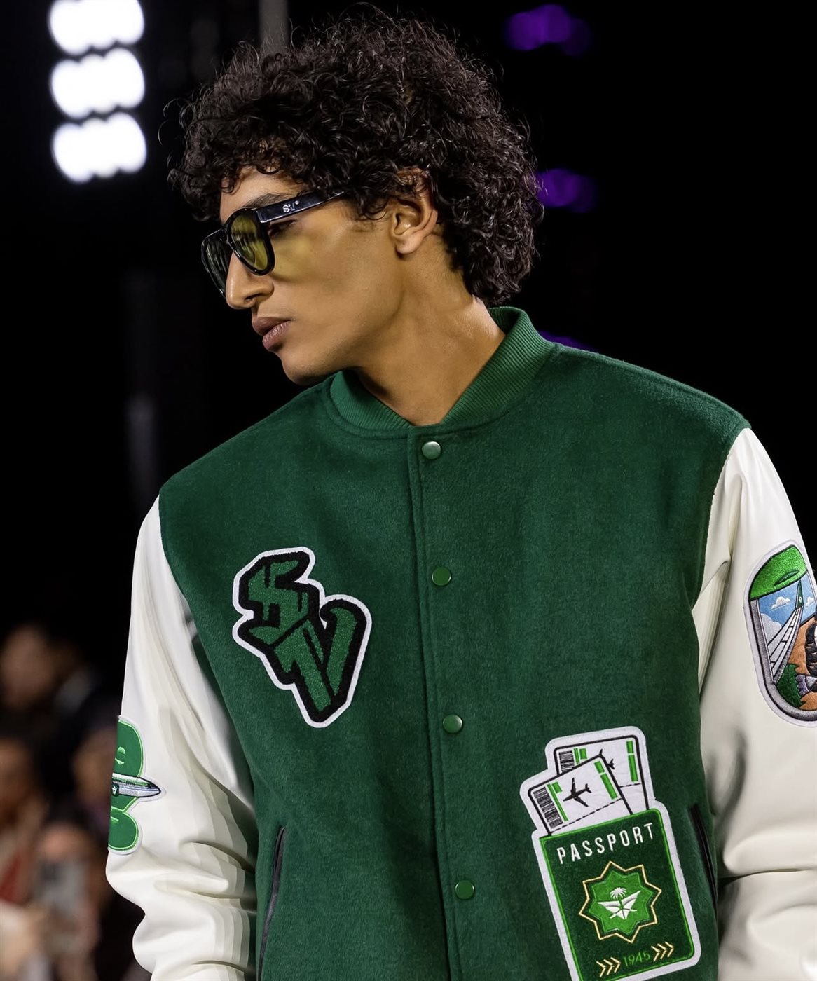 ومن بين أبرز ما لفت الأنظار: سترات بومبر جلدية خضراء بنقوش جرافيكية تُشبه شارات الطيران، وسترات بيسبول بشعارات “جناح” أو رقم الطراز، وبدل رياضية تتدرج فيها الدرجات من التركواز إلى الأزرق السماوي كما لو أنها مأخوذة من منظر نافذة الطائرة أثناء الرحلة.
