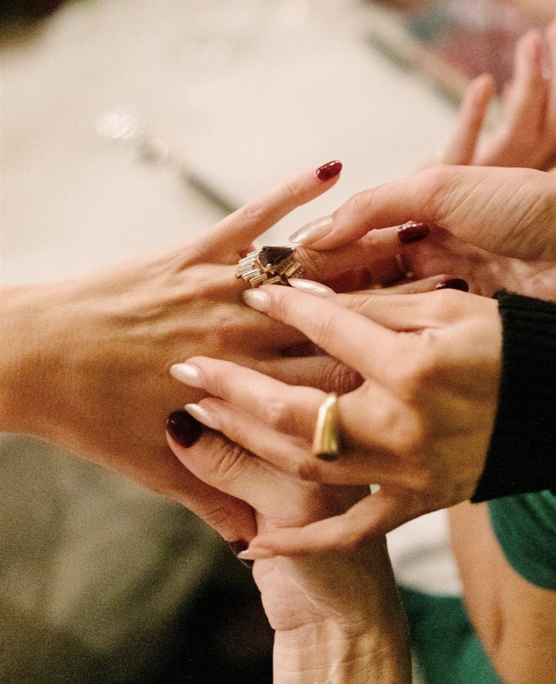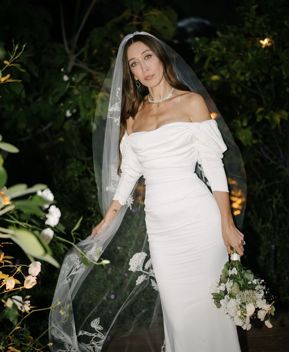تألقت العروس آلانا حديد بإطلالة خلابة حملت توقيع المصممة البريطانية الشهيرة فيفيان ويستوود (Vivienne Westwood)، حيث اختارت فستاناً كلاسيكياً أنيقاً بقصّة ناعمة وأقمشة انسيابية تبرز جمالها الطبيعي بأسلوب راقٍ وخالد. وأكملت العروس أناقتها بمجوهرات من Dorsey وخاتم ذهبي صُمّم خصيصاً لها من Sophia Kaman، ما أضاف لمسة شخصية مميزة على إطلالتها في هذا اليوم الاستثنائي.