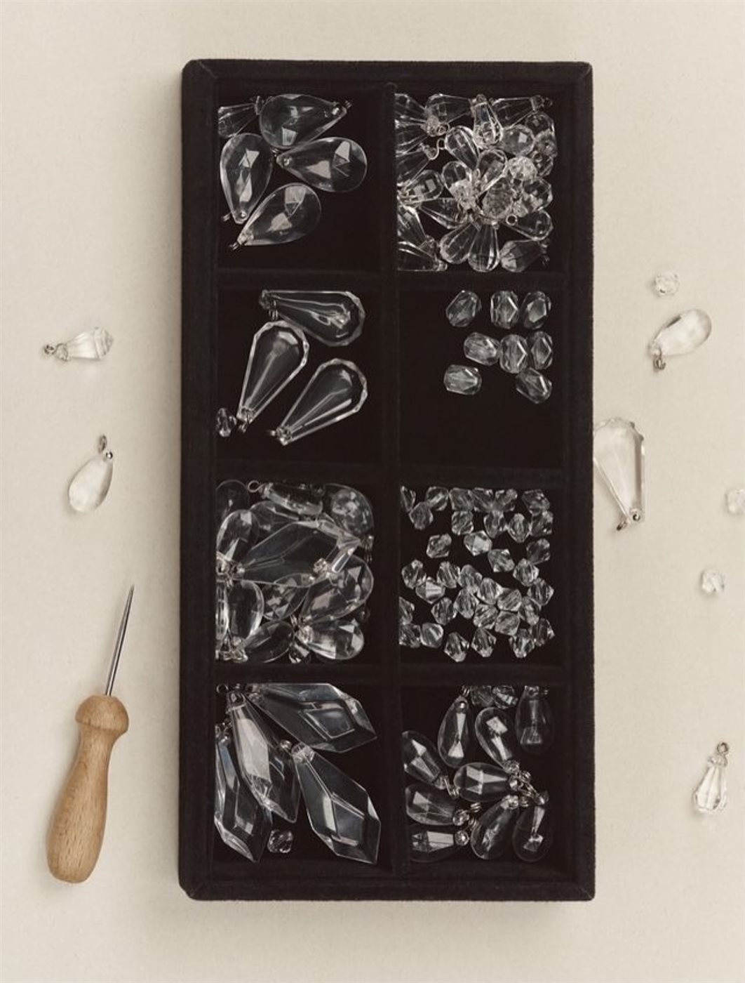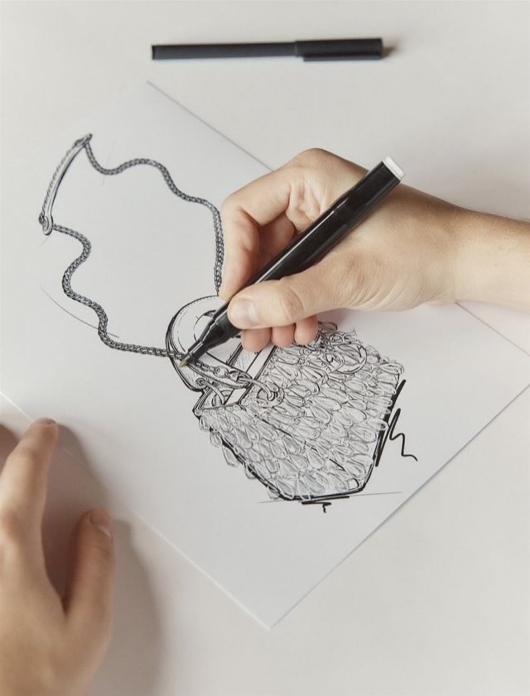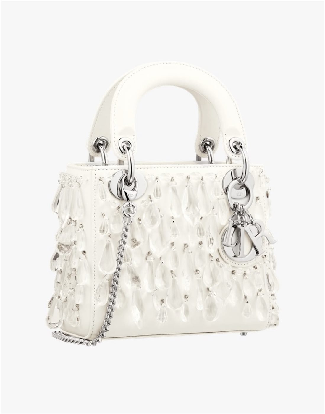 تزدان الحقيبة بلمسات مدهشة من “القطرات الشفافة” التي تم تنفيذها بدقة متناهية لتبدو كأنها ندى كريستالي يستقر فوق سطح الجلد، يعكس الضوء بانسيابية لافتة تُضفي إحساسًا بالحياة والنعومة في آنٍ واحد. هذه التفاصيل الدقيقة ليست مجرد عناصر زخرفية، بل هي امتداد لفكرة “الجمال في التفاصيل”، التي تمثل حجر الأساس في تصميمات Dior منذ تأسيسها على يد كريستيان ديور عام 1946.