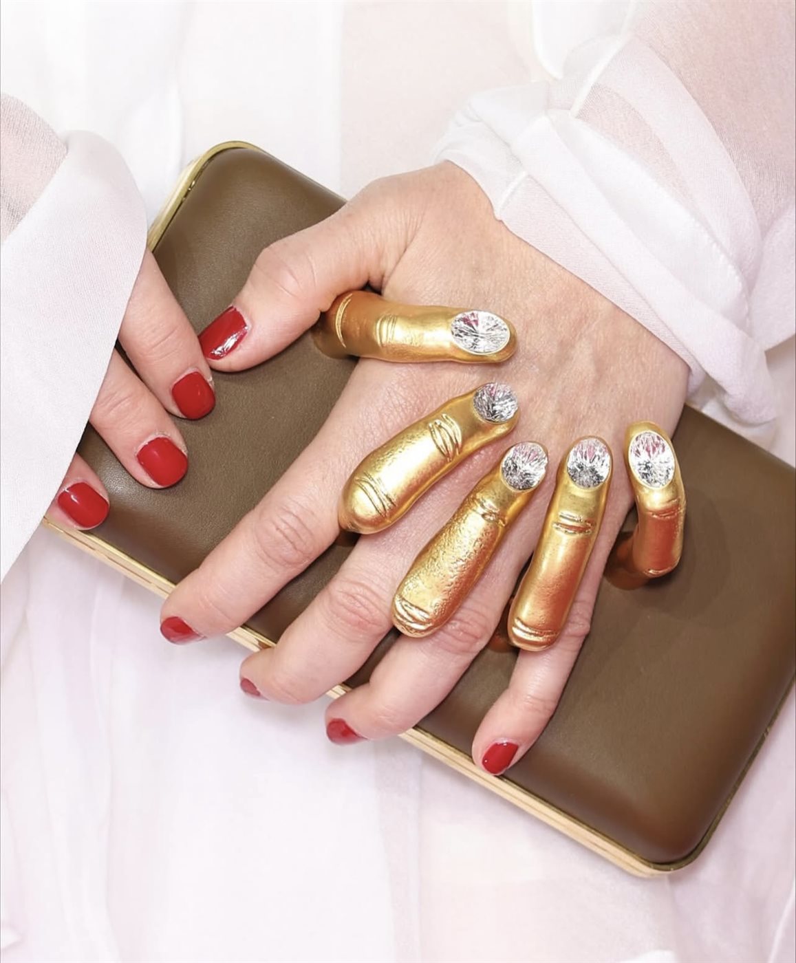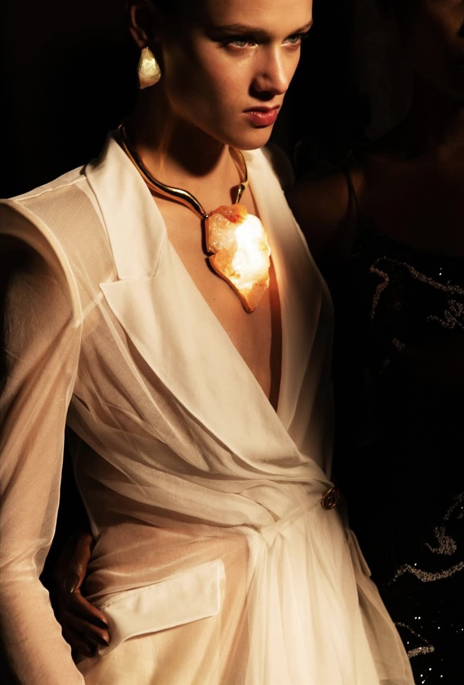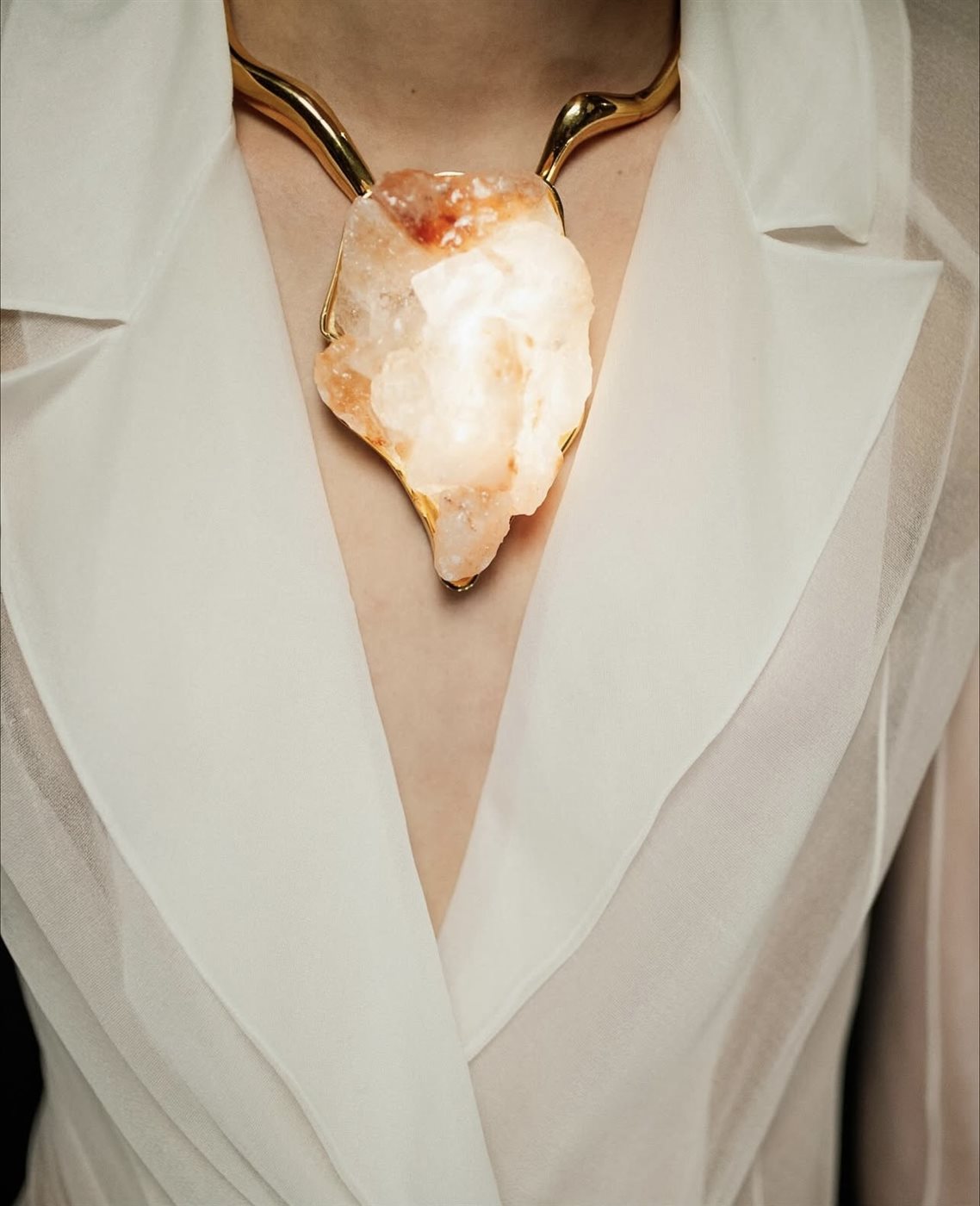 أما الإكسسوارات فكانت بمثابة توقيع فني للدار: أقراط حجرية مستوحاة من حجر الملح الطبيعي تعكس الضوء بنعومة، وعقد مطلي بالذهب من النحاس الأصفر يعزّز فخامة الإطلالة، في حين حملت حقيبة جلدية بنية مزدانة بتصميم فريد ليد ذهبية معدنية تلتف حول أصابعها في حركة رمزية تُجسّد مفهوم “اليد في اليد” الذي تشتهر به Schiaparelli كتعبير عن التواصل بين الإنسان والفن.