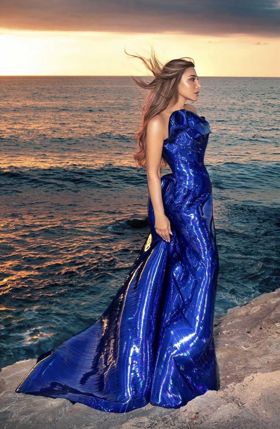 الفستان حمل توقيع الفخامة والرقي بامتياز، بتصميم يبرز انحناءات القوام بأناقة متقنة، وجاء بلون أزرق ميتاليك يعكس بريق البحر وغموضه في آنٍ واحد، ليضفي على الإطلالة لمسة ملكية تجمع بين القوة والأنوثة. أما تسريحة الشعر المنسدل بحرية ومكياجها المتوازن بين الإشراق والدفء، فشكّلا تكاملاً مثالياً مع المشهد الطبيعي الساحر الذي اختارته لتوثيق لحظتها.