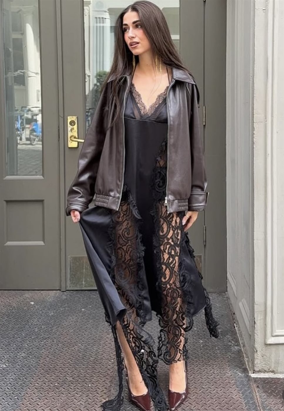 - للنهار أو نهاية الأسبوع، جرّبي الجاكيت مع تنورة ميدي أو فستان خفيف، لإضفاء لمسة من التناقض بين الخامة القاسية والأنوثة.