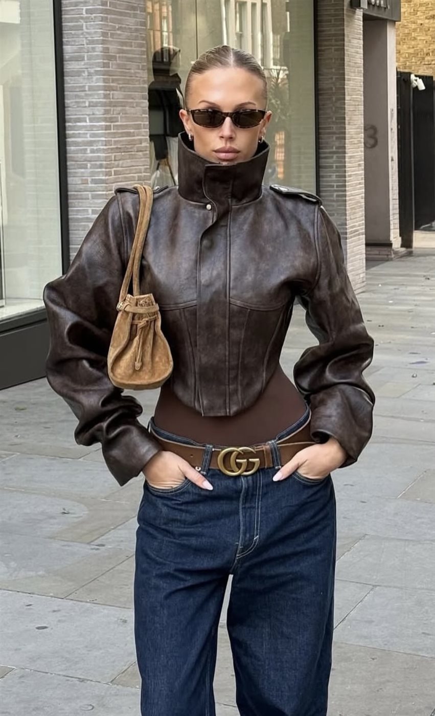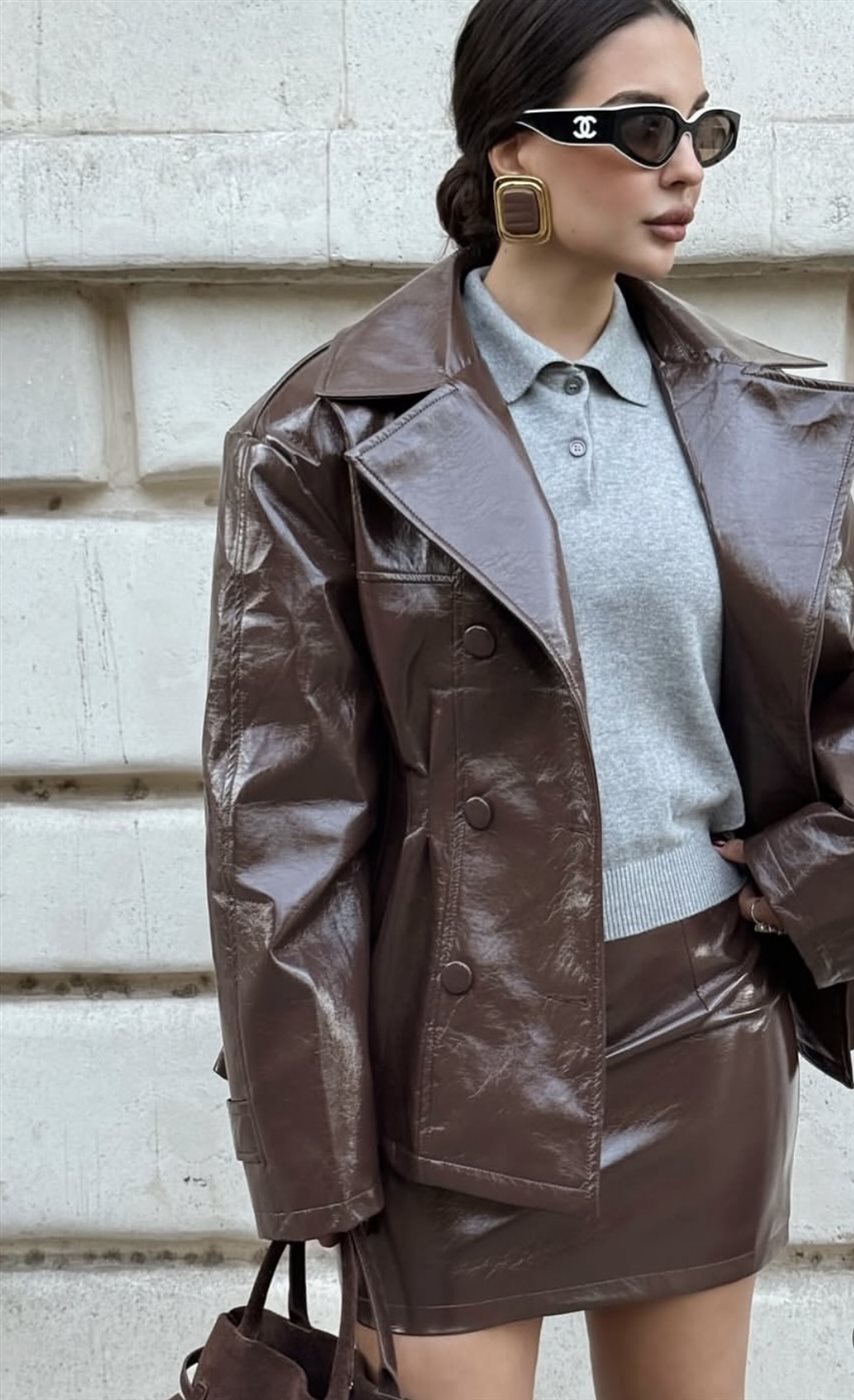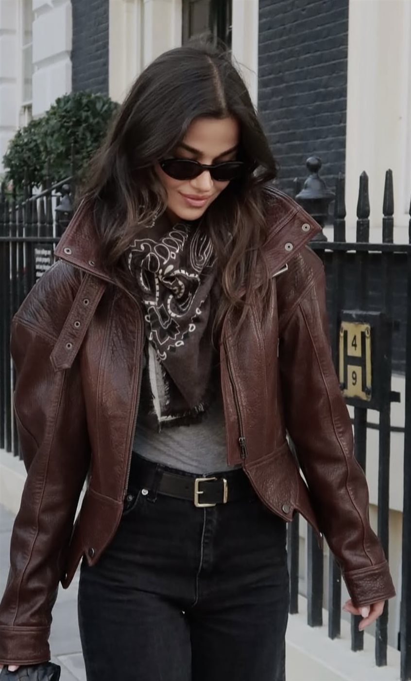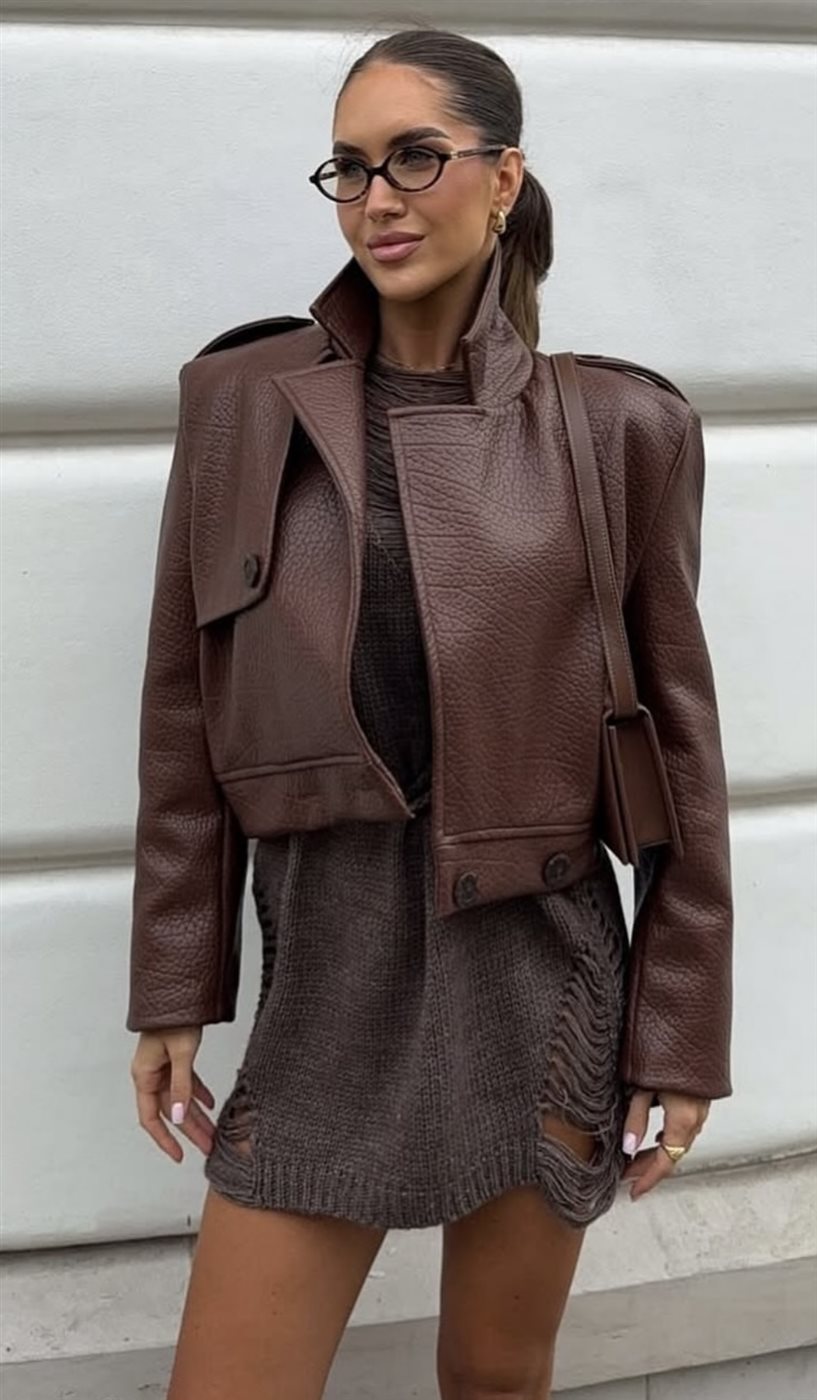 وما يميز الجاكيت البُني هو لونه الدافئ الذي يكسر رتابة الأسود التقليدي ويضفي شعورًا بالدفء والنعومة البصرية. فالجلد البُني ظهر كبديل أنيق للجلد الأسود في هذا الموسم مع تنوّع القصّات من البايكر إلى البومبر.