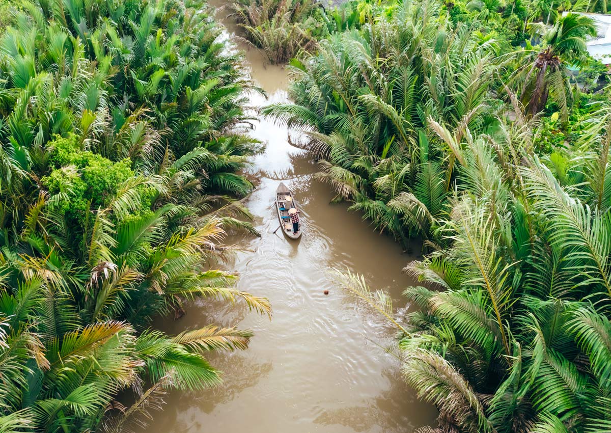 بمغادرة بنوم بنه في وقت متأخر من بعد الظهر، والدخول إلى أخيرًا نهر ميكونغ، وبحلول الصباح، ستكون في فيتنام، مكانًا أكثر صخبًا ونشاطًا. لا تزال قوارب السامبان الفردية ترمي الشباك، لكن الصيد الجبار يُمارس في المزارع العائمة، وهي أكواخ مبنية على صنادل مطلية بألوان زاهية. في تشاو دوك، ركبنا عربة تلفريك صاعدين جبل سام، ومنه رأينا تمثالًا لبوذا على طراز جبل راشمور يُنحت تخليدًا لأسطورة الإلهة با تشوا شو وتسع عذارى فائقات القوة.