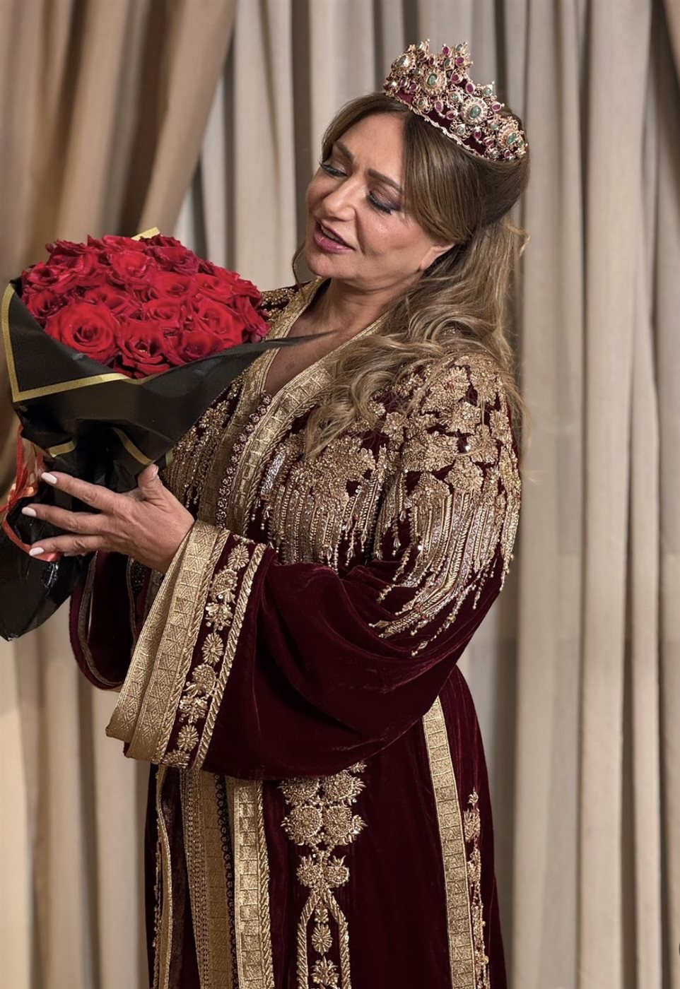 اختارت ليلى علوي قفطاناً مغربياً فاخراً من المخمل العنّابي المطرّز بخيوط ذهبية غنية بالتفاصيل الدقيقة، حمل لمسة ملكية بامتياز. التصميم تميّز بتطريزات يدوية على الصدر والأكمام والأطراف، مع خيوط متدلّية تضيف حركة فنية راقية. أما الحزام الذهبي الرقيق الذي يحدد الخصر فزاد الإطلالة توازناً وأناقة، مع المحافظة على الطابع التراثي الأصيل.