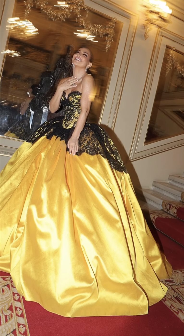 ظهرت جومانا مراد بفستان أصفر ضخم من تصميم اللبناني إيليو أبو فايصل (Elio Aboufayssal)، تميّز بتصميمه الفاخر الذي جمع بين الجرأة والأنوثة. الفستان صُمم من قماش فاخر يكسوه الدانتيل الأسود الناعم الذي أضاف لمسة درامية راقية، فبدت الإطلالة وكأنها مستوحاة من أناقة القصور الأوروبية القديمة ممزوجة بروح عربية أصيلة. أما القصة الواسعة للفستان فزادت من فخامته ومنحته حضورًا ملكيًا على السجادة الحمراء.