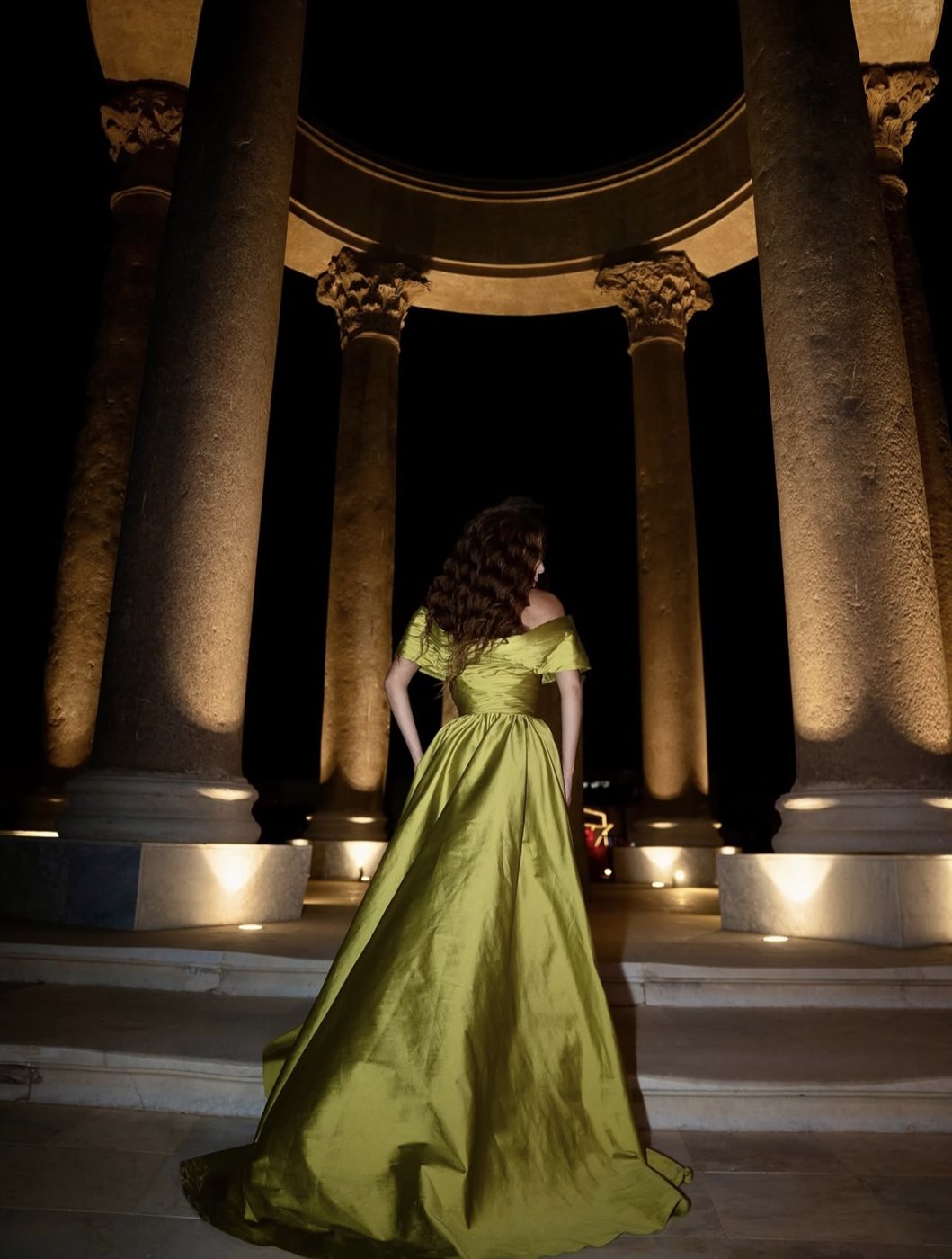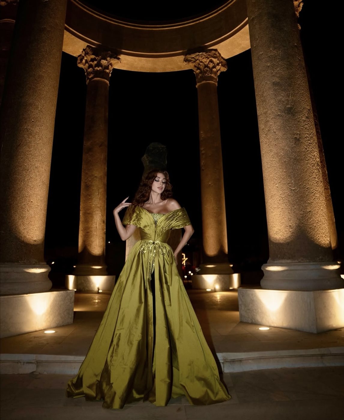 وق اعتمدت ميريام تسريحة شعر ويفي طويل منسدل على كتفيها، زاد من نعومة الإطلالة، فيما اختارت مكياجاً درامياً ارتكز على العيون المحددة بالكحل الأسود والشفاه النود الفاتحة، ليُبرز ملامحها الشرقية الجذابة. كما نسّقت إطلالتها مع مجوهرات بسيطة لتترك التركيز على الفستان اللافت والإضاءة المحيطة بها، والتي صمّمت لتمنح المشهد طابعاً أسطورياً وسط الأعمدة المضيئة التي بدت كأنها جزء من عرض فني متكامل.