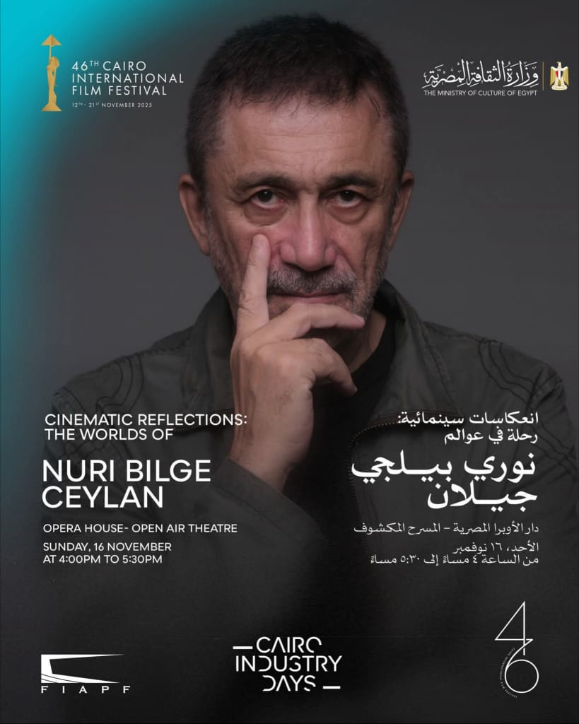 في إطار فعاليات أيام القاهرة لصناعة السينما المُقامة ضمن أنشطة مهرجان القاهرة السينمائي الدولي الـ46، يستضيف المسرح المكشوف بدار الأوبرا المصرية اليوم الأحد 16 نوفمبر محاضرة بعنوان "انعكاسات سينمائية: رحلة في عوالم نوري بيلجي جيلان"، وذلك من الساعة 4:00 حتى 5:30 مساءً، ويدير الجلسة الناقد السينمائي أحمد شوقي، رئيس الاتحاد الدولي للنقاد السينمائيين (فيبريسي) والاتحاد الأوروبي لنقاد السينما (EFCA).