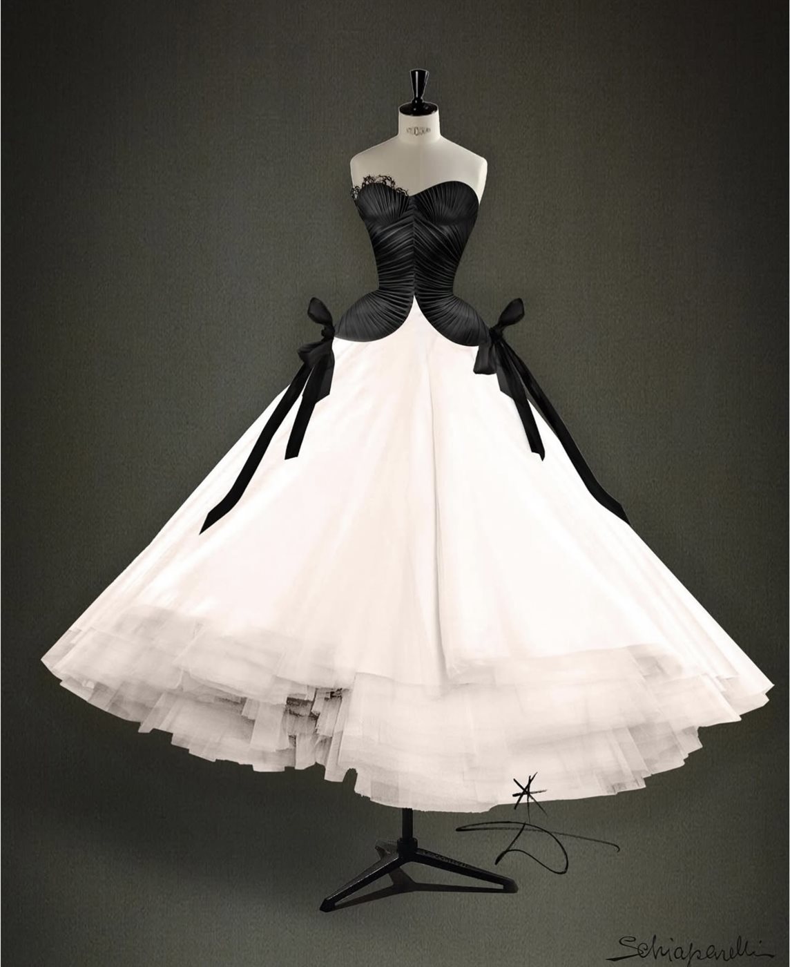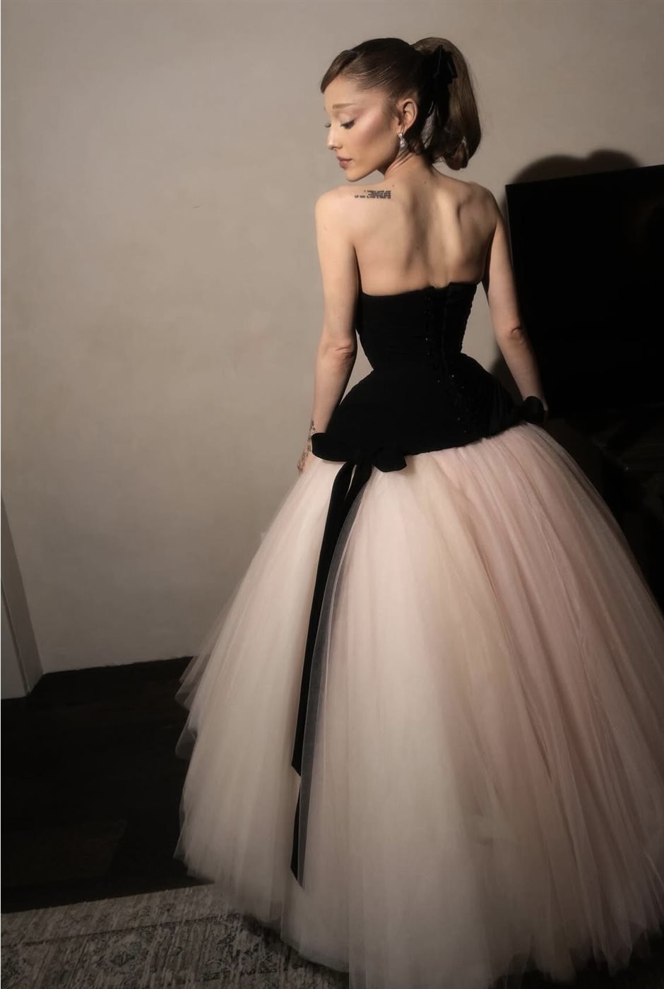 اعتمدت أريانا غراندي فستان سهرة درامياً بمواصفات دقيقة تجمع بين الفخامة والحِرفية العالية. جاء تصميم الجزء العلوي بقالب كورسيه فاخر من الكريب الأسود والساتان، مشدوداً بطريقة لافتة عند الظهر عبر نظام ربط دقيق يبرز رشاقة خصرها ويمنح الفستان شكله الهيكلي المتقن. ولتعزيز الطابع الأنثوي الناعم، أضيفت ربطات جانبية رقيقة عند الخصر، بينما تزيّن الصدر بتطريز Keyhole الأيقوني الخاص بشياپاريللي، والذي تحوّل إلى عنصر بصري محوري يلتقط الضوء ويضفي لمسة فنية على الإطلالة.