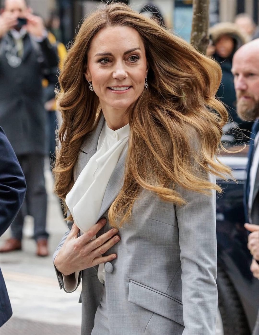 تألّقت كيت ببدلة أنيقة من توقيع المصمم رولان موريه، المعروف بخطوطه الانسيابية وقصّاته المعمارية التي تبرز الرقي والبساطة في آن واحد. ونسّقت البدلة مع بلوزة أنثوية من علامة Knatchbull، فيما حملت حقيبة متقنة التصميم من Smythson، لتضيف لمسة كلاسيكية بريطانية الطابع. أما الإكسسوارات، فاختارت لها أقراطاً راقية من Mappin & Webb، وهي دار تحمل تاريخاً عريقاً في صياغة المجوهرات الملكية. الإطلالة بمجملها جاءت متناغمة ومتوازنة، تعكس صورة الأميرة التي تجمع بين الحسّ العملي والذوق الرفيع.