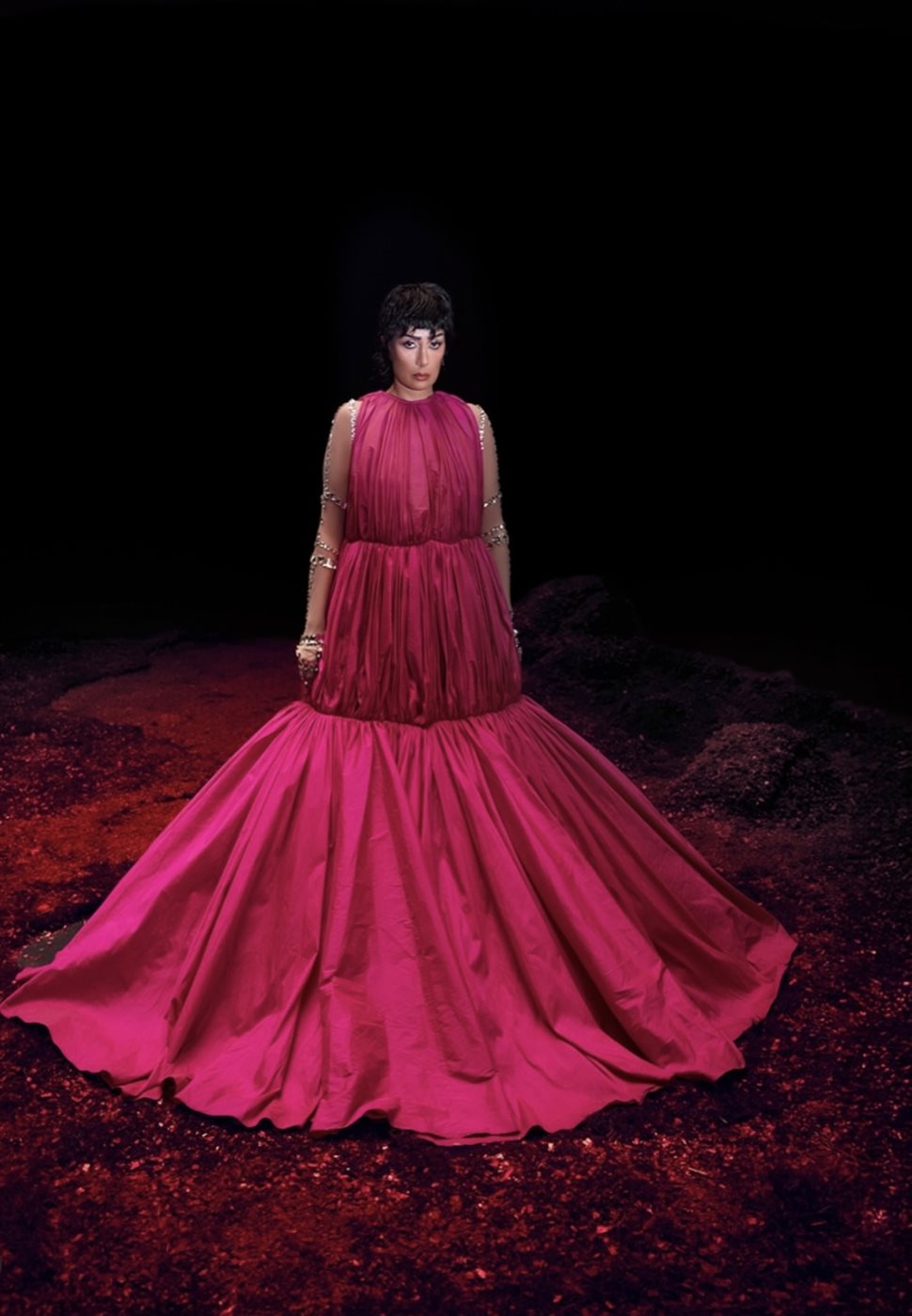 الفستان الذي يتّسم بتصميم دائري واسع للغاية ينساب حول النجمة كلوحة فنية، جاء بقماش لامع بدرجات الفوشيا القوية، مع قصّة علوية Draped ناعمة تبرز الأكتاف وتزيد من فخامة الإطلالة. أما محيط الفستان الواسع فخلق هالة مسرحية تحاكي أجواء عروض الأزياء الراقية وتحوّل المشهد بأكمله إلى قطعة فنية متكاملة. وقد ساهمت الخلفية الحمراء اللامعة في تعميق التأثير البصري للصورة، مضيفة طابعاً درامياً يعزّز قوة اللون ويضع غادة في قلب تكوين فني مميز.