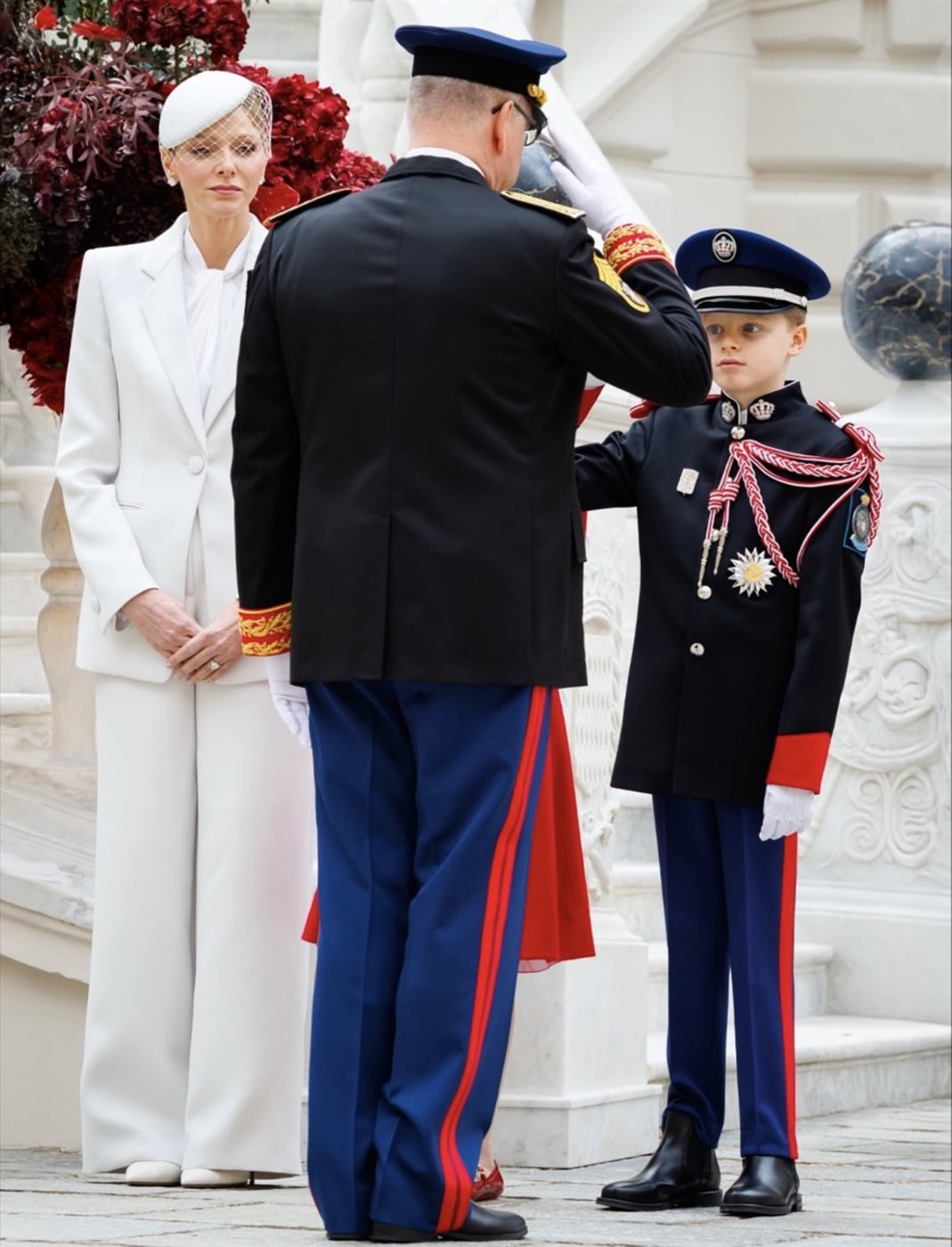 البدلة البيضاء اللامعة جاءت بقصّة أنثوية دقيقة تسمح بانسيابية الحركة، بينما منح اللون الأبيض حضوراً يليق بالمناسبة الوطنية. وحرصت الأميرة شارلين على إضافة لمسة رمزية تعكس فخرها بإرث موناكو، عبر دبوس عسكري مزدان بألوان العلم الأحمر والأبيض، وضعته على الصدر ليكون العنصر الأبرز في اللوك، ويمنح الإطلالة معنى يتجاوز حدود الأزياء ليصل إلى عمق الهوية الوطنية.