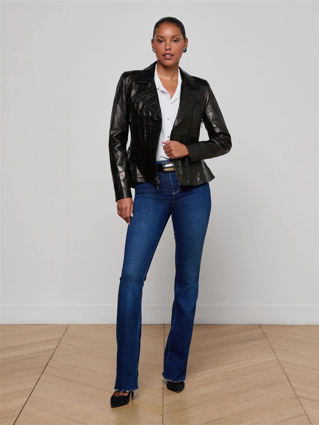 - جينز داكن لكسر حدة الجلد مع لمسة كاجوال أنيقة.