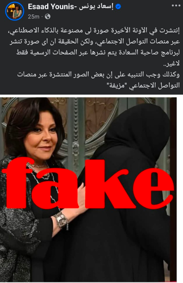 وحرصت إسعاد يونس، على التأكيد على أن هذه الصورة مزيفة وتم تنفيذها بتقنية الذكاء الاصطناعي AI، وذلك بنشرها تنويه عبر حسابها الرسمي على "فيسبوك"، قالت فيه: "انتشرت في الآونة الأخيرة صورة لى مصنوعة بالذكاء الاصطناعي، عبر منصات التواصل الاجتماعي، ولكن الحقيقة أن أى صورة تنشر لبرنامج صاحبة السعادة يتم نشرها عبر الصفحات الرسمية فقط لاغير.. وكذلك وجب التنبيه على إن بعض الصور المنتشرة عبر منصات التواصل الاجتماعي "مزيفة".
