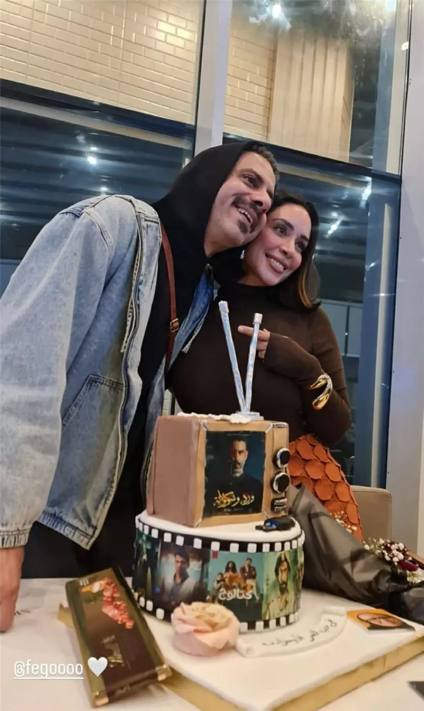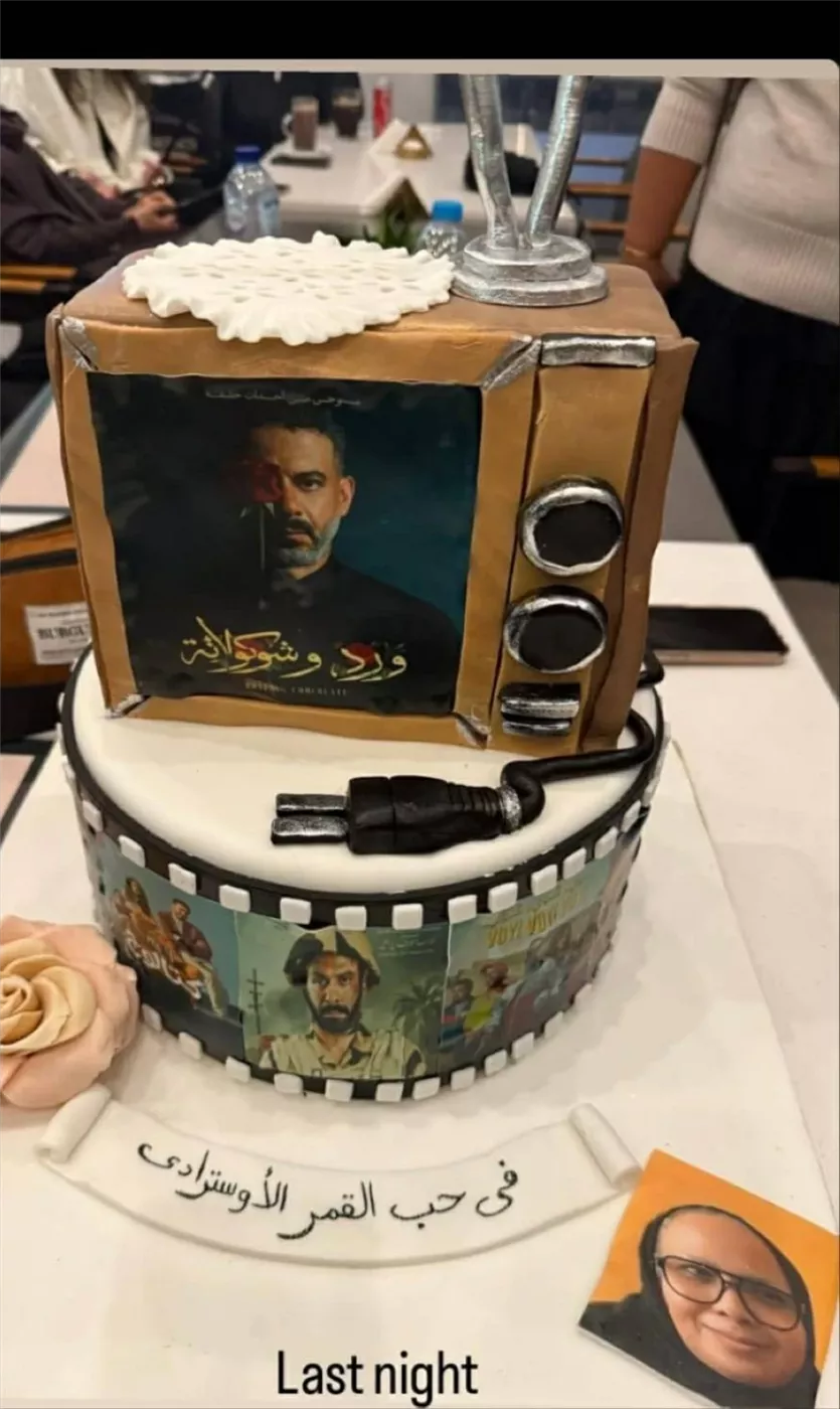 وظهرت بسنت شوقي خلال الصور رفقة محمد فراج، وهما ممسكان بتورتة عيد الميلاد والتي حملت بوسترات أشهر أعماله ومن بينها شاشة تلفزيون والتي تحمل بوستر مسلسل “ورد وشوكولاتة”، وبجانب بوسترات أعماله الفنية ظهرت صورة صغيرة لوالدة الإعلامية شيماء جمال.
