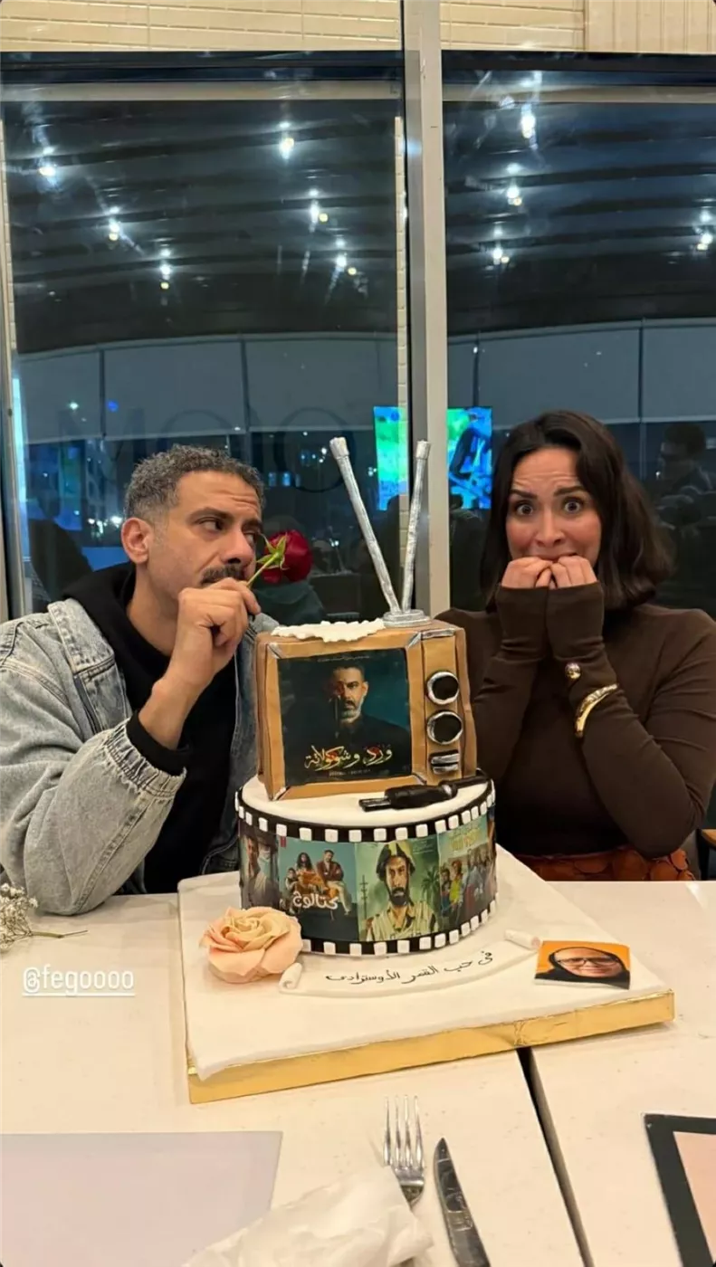 بتورتة تحمل بوسترات أعماله الفنية.. بسنت شوقي تحتفل بعيد ميلاد محمد فراج