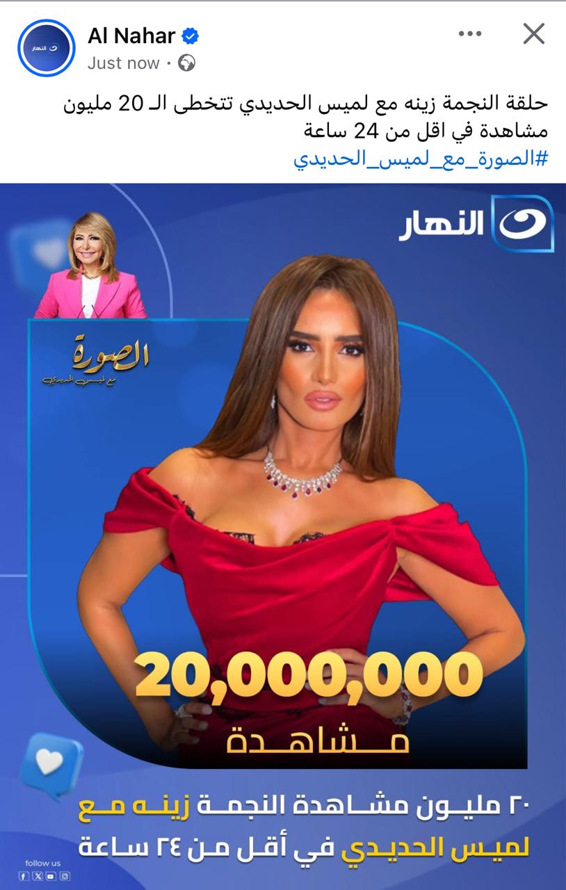 حصدت حلقة النجمة زينة مع الإعلامية لميس الحديدي في برنامج “الصورة” على قناة النهار انتشارا واسعا عبر منصات التواصل الاجتماعي حيث تصدرت الترند خلال الساعات الأخيرة وحققت مقاطع الحلقة نحو 20 مليون مشاهدة في أقل من 24 ساعة نتيجة التصريحات التي أثارت تفاعلا كبيرا بين الجمهور.