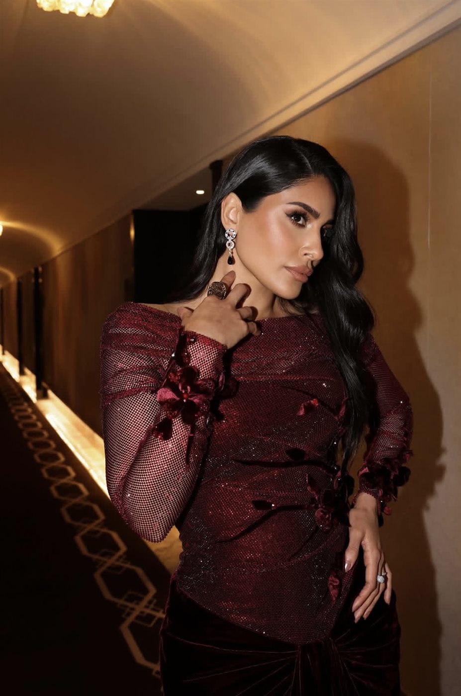 إلهام علي تألقت بفستان مُفصّل خصيصًا لها من توقيع Antoine Kareh Couture، جاء بتصميم يجمع بين الفخامة والدراما الهادئة. الجزء العلوي للفستان صُمّم من قماش مشغول بالترتر الناعم بتدرجات الأحمر العميق، مع خامة شفافة مزيّنة بلمسات لامعة أبرزت منطقة الكتفين والذراعين بطريقة أنيقة دون مبالغة. أما الجزء السفلي فكان من قماش القطيفة الفاخر بدرجة البرغندي الداكن، ينساب بانسيابية راقية تمنح القوام طولًا وأناقة إضافية، مع طيّات دقيقة عند الخصر تُبرز جمال القصة وتضيف عنصرًا بصريًا جذابًا.