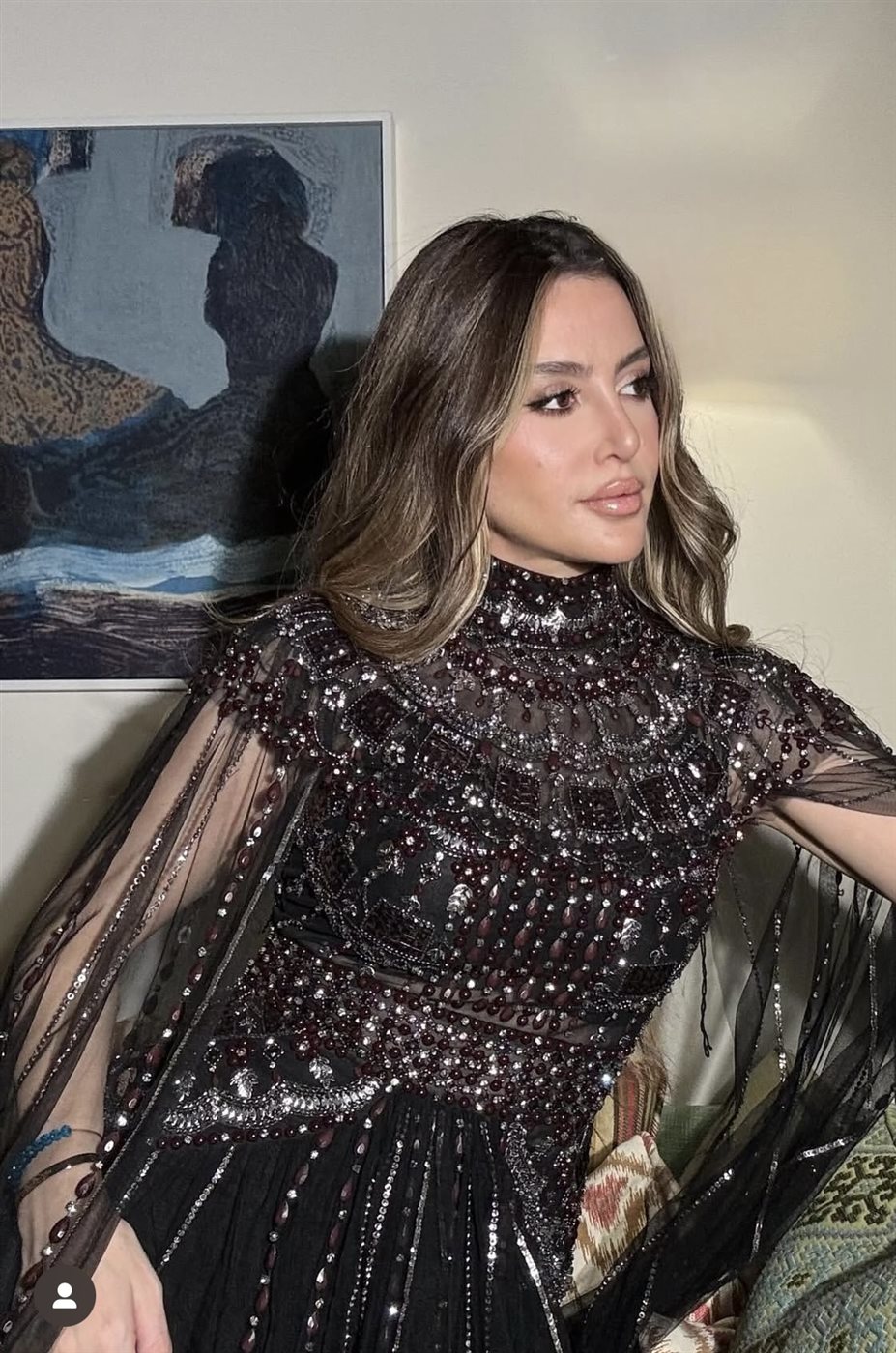 كما اختارت مرام فستانًا أسود فخمًا بتصميم معقّد وتطريزات غنية، يبرز جمال التفاصيل المتقنة التي غلب عليها الطابع الملوكي الشرقي. الجزء العلوي من الفستان جاء بتصميم هاي-نيك عالي الرقبة، مطرّز بالكامل بالخيوط المعدنية والأحجار اللامعة التي تشكّل لوحة هندسية دقيقة، تعكس الضوء بطريقة ساحرة وتضيف إلى الإطلالة هالة درامية آسرة. هذا الأسلوب في التطريز أعاد إلى الأذهان أرشيف الأزياء التاريخية المستوحاة من الحضارات الملكية القديمة.