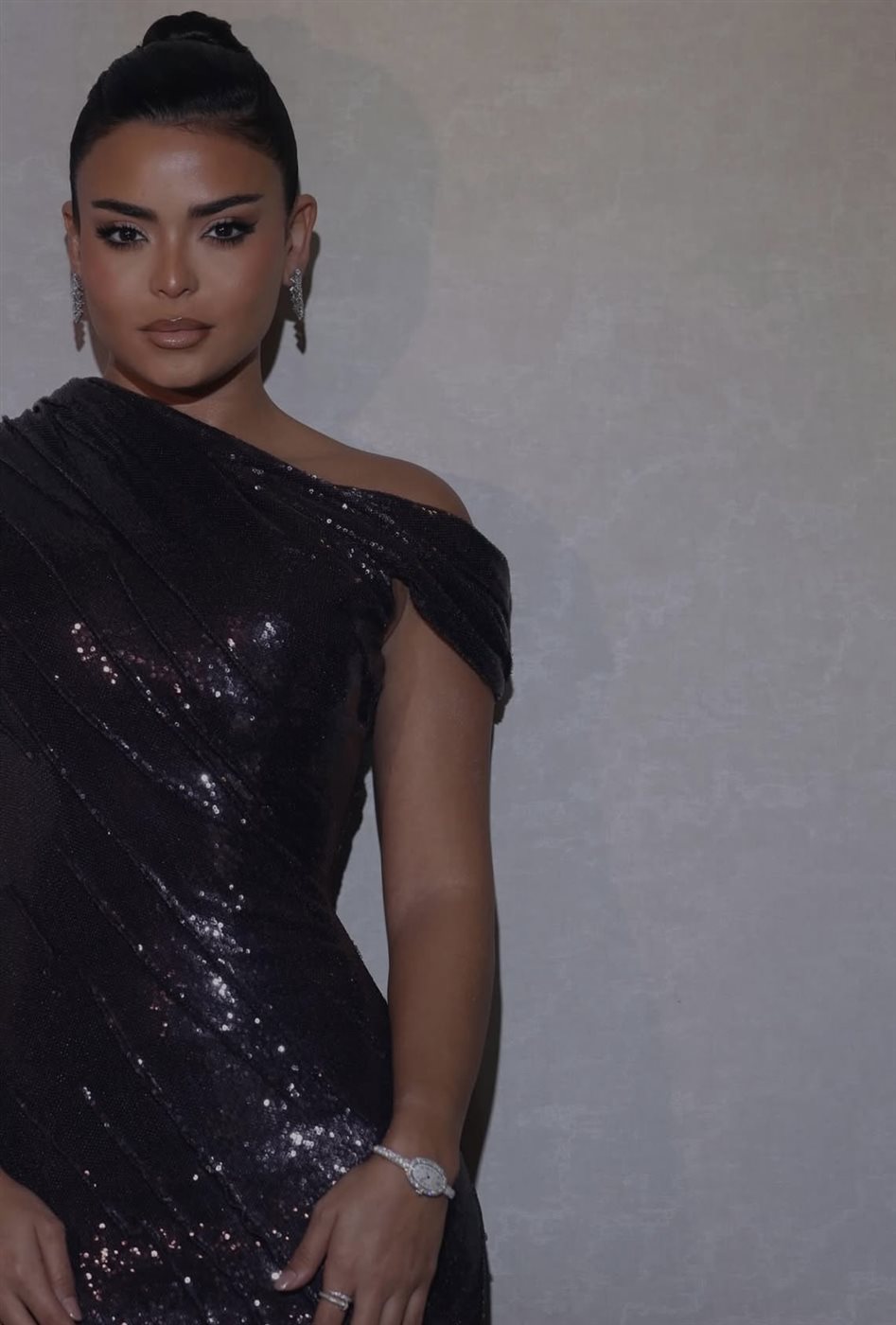 الفستان المصنوع من قماش لامع داكن يغمره البريق جاء بقصّة انسيابية تحتضن القوام وتبرز جماله دون مبالغة. تميّز التصميم بكتف واحدة وانحناءات ناعمة تُبرز الحركة داخل القماش الميتاليك، مما منح الإطلالة حضورًا درامياً واضحًا دون أن تفقد لمستها الراقية. التفاصيل التي تجمع بين الهدوء والبريق جعلت الفستان واحدًا من الإطلالات الأبرز في ليلة الافتتاح.