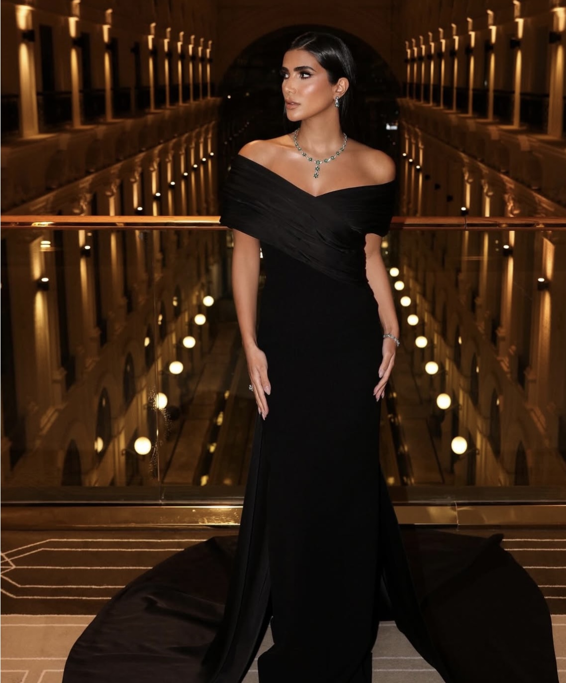 ظهرت ريم سامي بفستان أسود طويل من توقيع المصمم رامي قاضي، جاء بتصميم أنثوي راقٍ يعكس فلسفة البساطة الفاخرة. الفستان تمتع بقصّة انسيابية منسدلة مع ذيل ممتد يمنح الإطلالة بعدًا ملكيًا، فيما تميز الجزء العلوي بقماش مطوي بطريقة هندسية أنيقة تنسدل بنعومة على منطقة الأكتاف، كاشفة عن ياقة أوف شولدر تزيد من جاذبية المظهر وتبرز جمال العنق والكتفين. اللون الأسود الكلاسيكي بدا خيارًا مثاليًا لهذه الأمسية الاحتفالية، إذ يجسّد القوة والوقار مع لمسة رومانسية راقية.