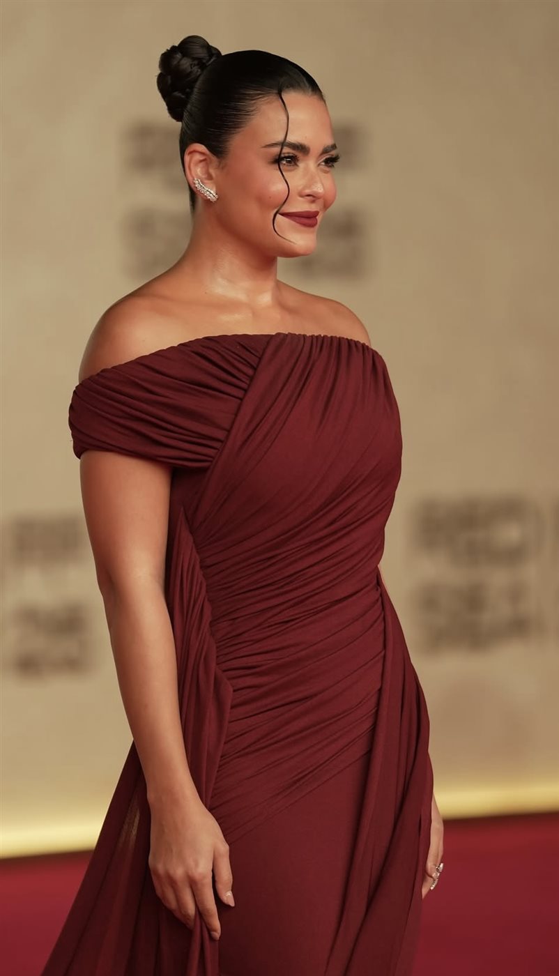 ارتدت أسماء جلال فستاناً فاخراً باللون الخمري العميق، بدرجة دافئة تليق بلون بشرتها وتبرز ملامحها بشكل آسر. الفستان جاء بتصميم الأوف شولدر الذي كشف عن الكتفين بأناقة، مع دريبينج (كشكشة ناعمة) تغطي كامل الجزء العلوي وتنساب بانسيابية على القوام، ما أضفى على الإطلالة طابعاً ملكياً ناعماً.
