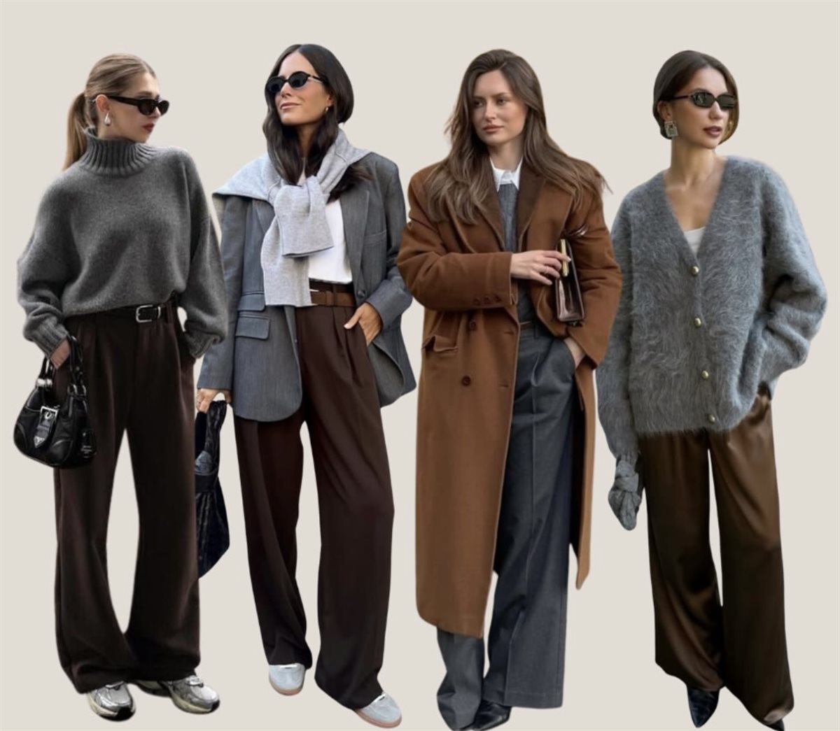 حيث تناغماً لافتاً بين درجات الرمادي الناعمة ودفء البني العميق. تمتاز هذه التركيبة بأنها عملية وعصرية، ويمكن اعتمادها في الإطلالات اليومية من خلال سراويل واسعة، معاطف طويلة، أو كنزات صوفية تمنح المظهر توازنه المثالي.