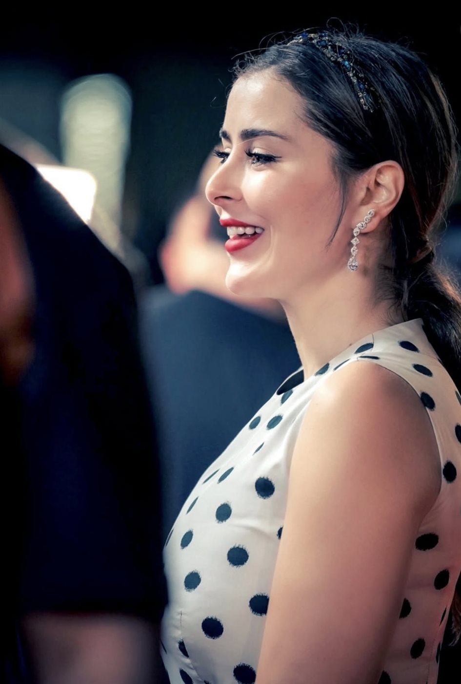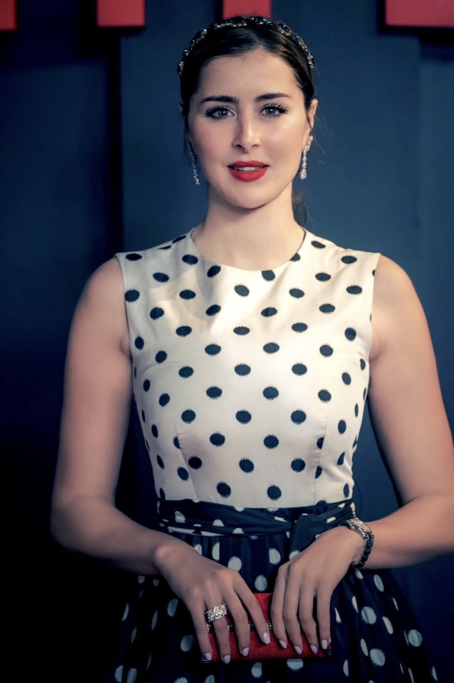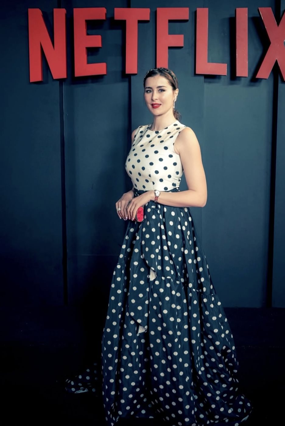 اختارت عائشة فستانًا بنقشة البولكا دوت المميزة من توقيع دار Carolina Herrera، وهي علامة اشتهرت بلمساتها الأنثوية الراقية وقصّاتها الكلاسيكية التي تتجاوز حدود الزمن. جاء الجزء العلوي للفستان باللون الأبيض المرصّع بنقاط سوداء متناثرة، بينما اتخذ الجزء السفلي تصميمًا انسيابيًا واسعًا بطبقات متحركة مزدانة بالنقشة نفسها ولكن بخلفية داكنة، ما منح الإطلالة توازنًا بصريًا جذابًا بين العصرية والكلاسيكية. كما أضفى الحزام القماشي عند الخصر تحديدًا أنيقًا للقوام، معززًا انسيابية التصميم.