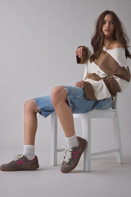 - ارتداء Suede Sneakers بلون ترابي مع جينز مستقيم القصة وقميص كلاسيكي يمنح إطلالة بسيطة وراقية.