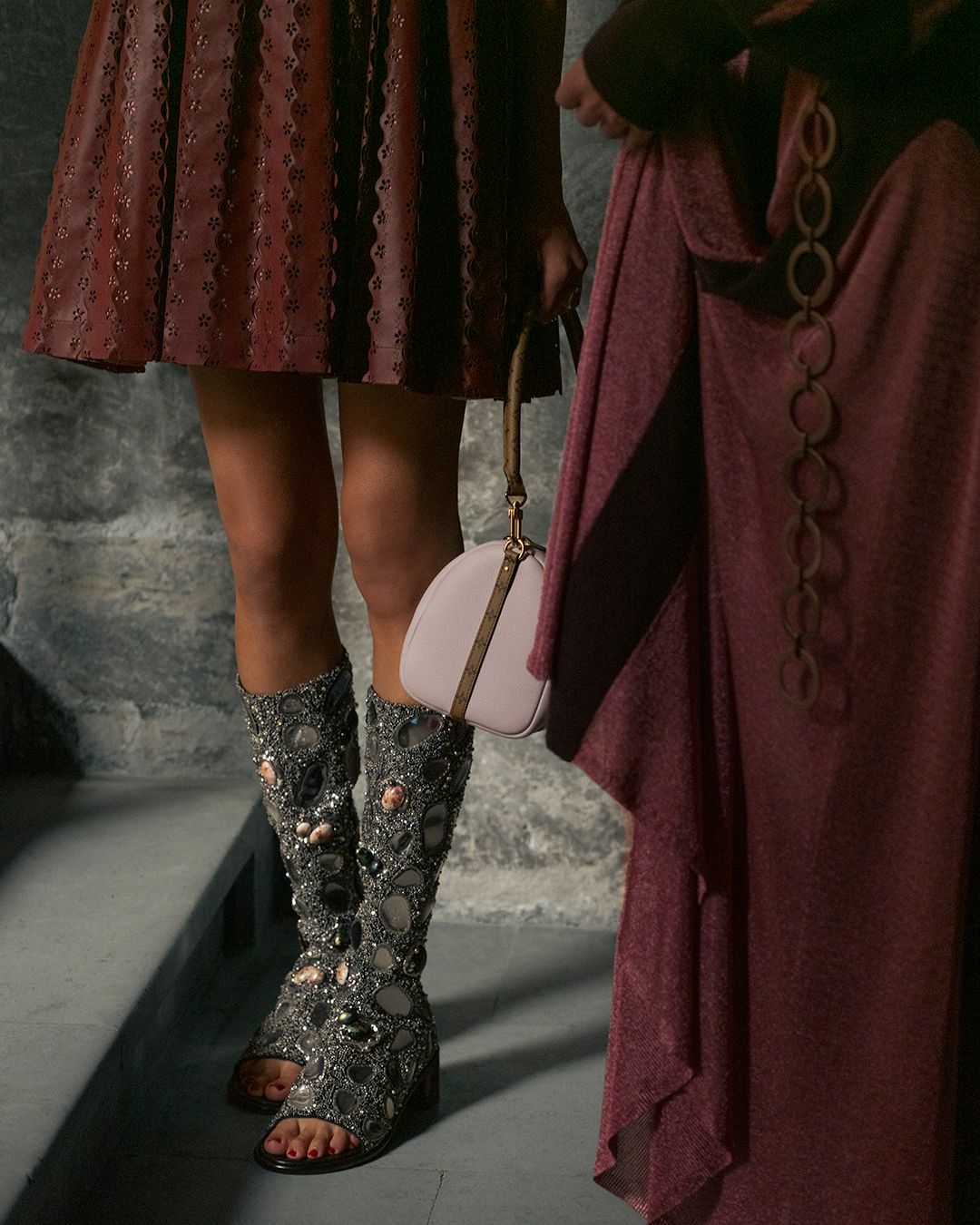 الألوان والخامات لعبت دوراً محورياً في إبراز هوية المجموعة؛ إذ هيمنت الجلود، المعادن، والفضيات اللامعة، إلى جانب لمسات باروكية غنية. كما قدّمت الدار فساتين قصيرة مرصعة بالترتر، ومعاطف فضية مزدوجة الأزرار، نسّقها غيسكيير بجرأة مع قبعات بيسبول سوداء، في مزيج ذكي يجمع بين الرسمية الكلاسيكية وروح جيل Z العفوية.