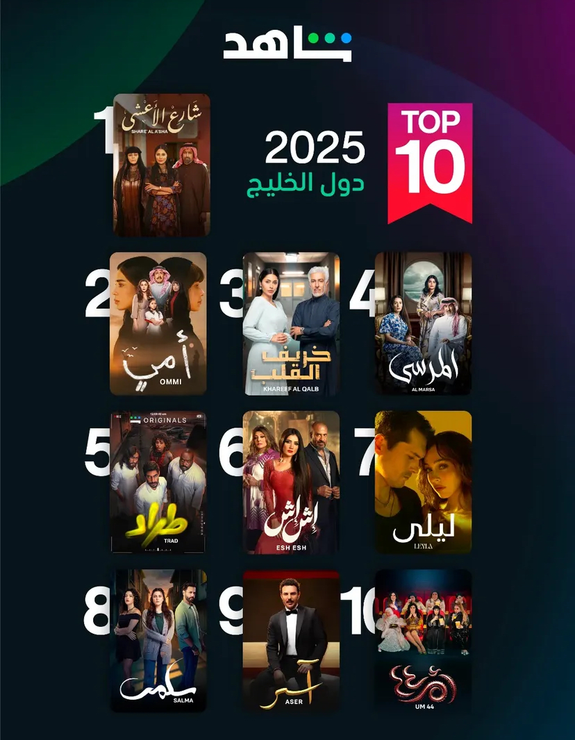 كشفت منصة “شاهد” عن قائمة الأعمال الدرامية المفضلة لدى الجمهور السعودي خلال عام 2025 حيث تصدر مسلسل “شارع الأعشى” القائمة بعد النجاح اللافت الذي حققه خلال الموسم الرمضاني الماضي في وقت أعلنت فيه المنصة أيضا عن الأعمال الأكثر مشاهدة في مصر وسط منافسة قوية بين الدراما الخليجية والمصرية والأعمال المعربة.