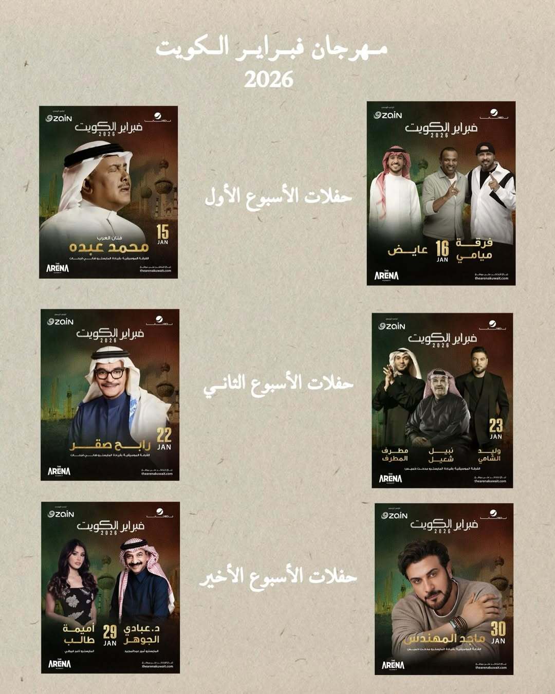 يحيي فنان العرب محمد عبده أولى حفلات مهرجان "فبراير الكويت" على مسرح الأرينا كويت، وذلك يوم الخميس 15 يناير 2026. وكشفت روتانا عن طرح تذاكر الحفل قريباً للراغبين بحضوره، وسط توقعات بإقبال كبير.