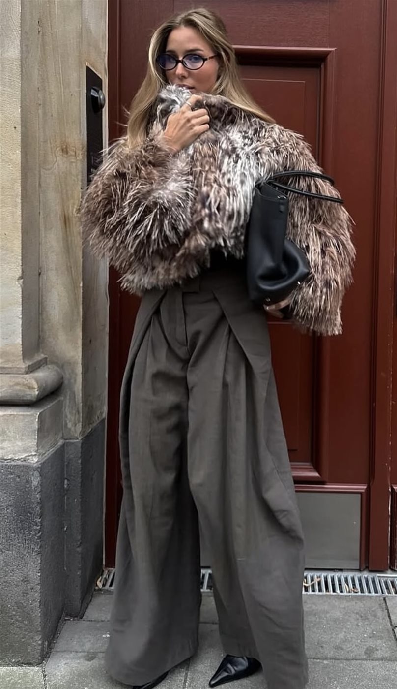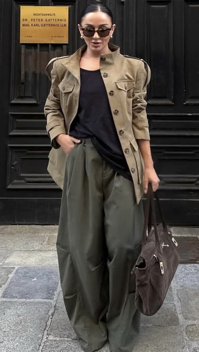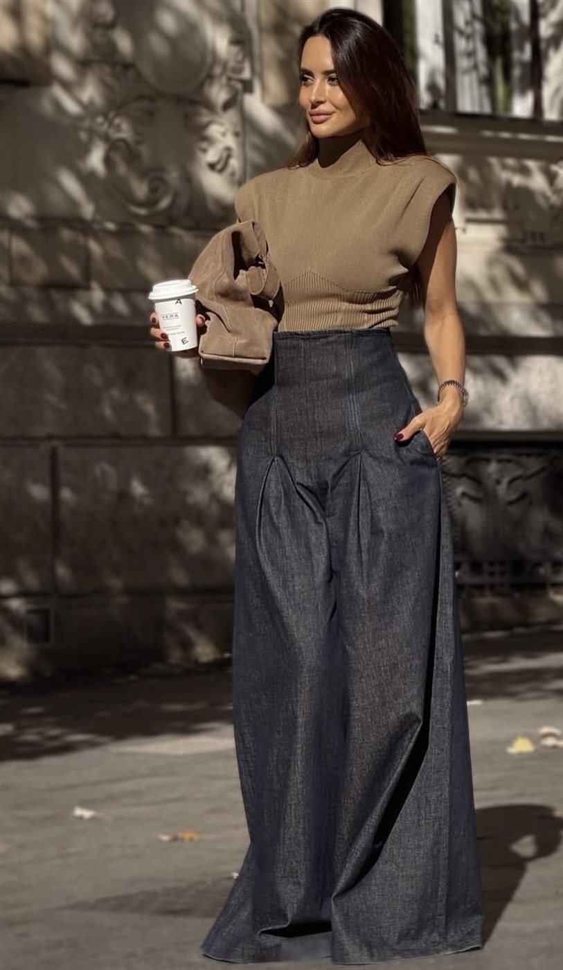 - قاعدة التوازن: مع البنطال الواسع اختاري قمة أقرب للجسم: توب ضيق، قميص محدد الخصر، أو سترة قصيرة (cropped) لتحديد النِّسب.