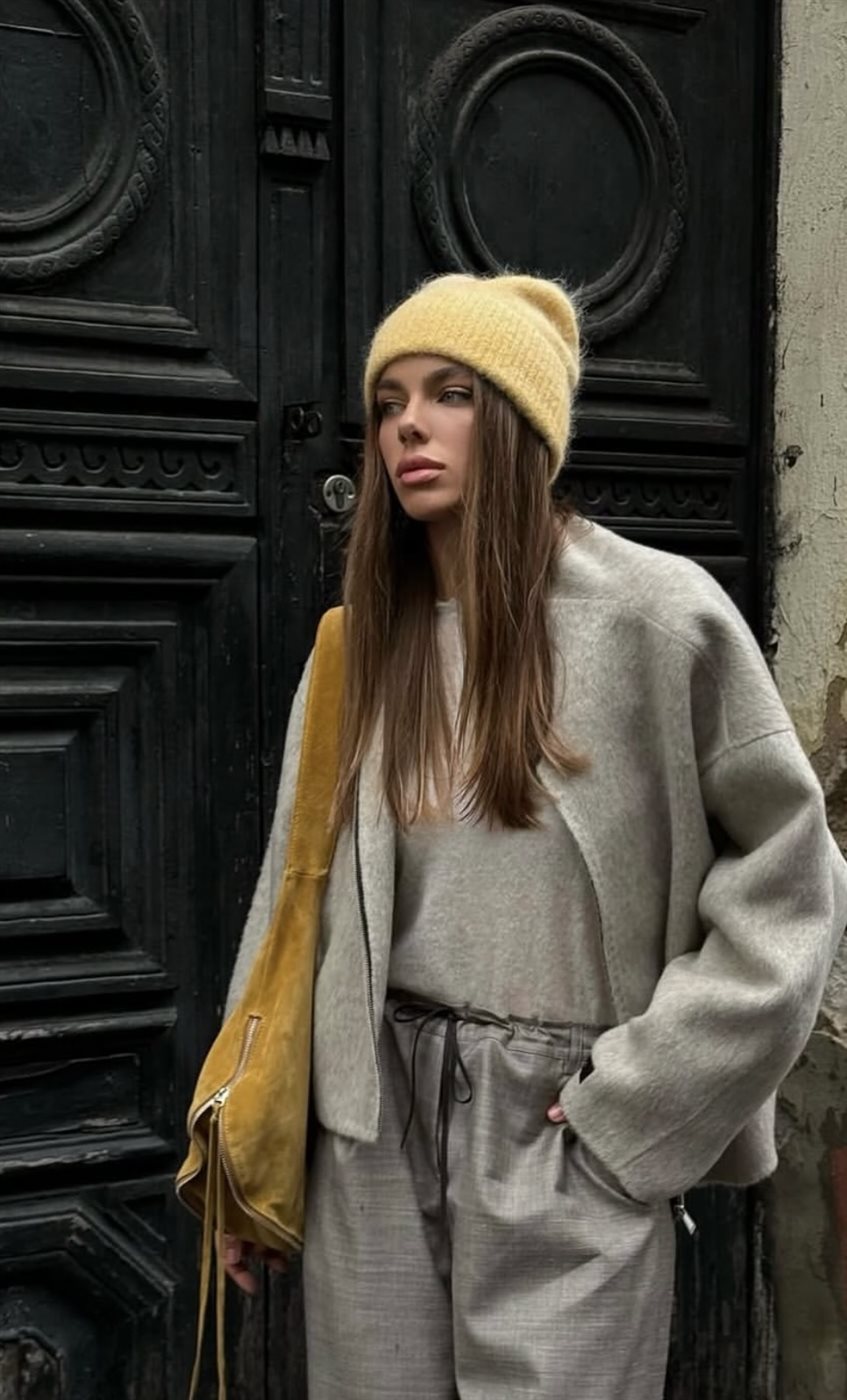 - أسلوب أنيق : قبعة صوفية ناعمة بلون حيادي مع معطف كلاسيكي وبنطال قماشي وحقيبة تضيف لمسة راقية للإطلالة اليومية.
