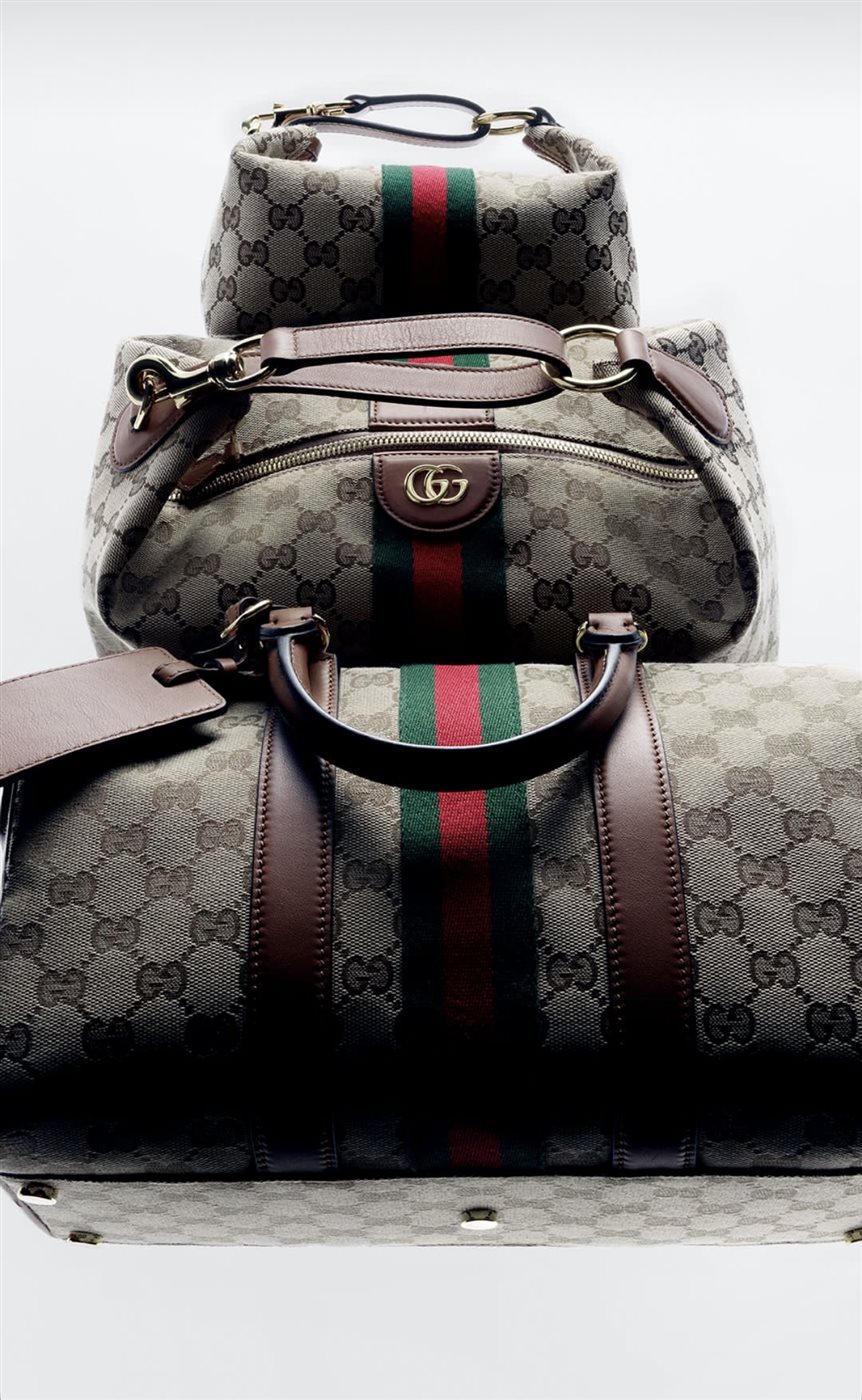 وتتصدّر مجموعة الحقائب المشهد، حيث برزت تصاميم مصنوعة من خامة GG Supreme الشهيرة، التي تُعد من أكثر المواد ارتباطًا بهوية الدار. وتأتي هذه الحقائب بأحجام مختلفة، لتلبي احتياجات السفر القصير والتنقل اليومي، مع الحفاظ على الطابع الفاخر الذي يميز جوتشي. ويبرز خط الويب الكلاسيكي باللونين الأخضر والأحمر كعنصر بصري أساسي، في إشارة واضحة إلى إرث الدار الممتد منذ عقود، والذي لا يزال حاضرًا بقوة في تصاميمها الحديثة.