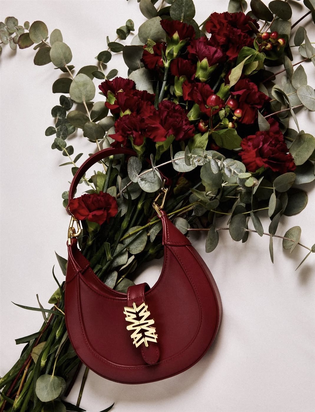 تتصدّر الألوان الغنية المشهد، وعلى رأسها الأحمر العميق بدرجاته المخملية، الذي يرمز إلى الدفء والفخامة والاحتفال. تظهر الحقائب الجلدية المنحنية بتصميم أنثوي ناعم، تتوسطها علامة الدار الذهبية الأيقونية المصاغة بأسلوب نحتي لافت، ما يضفي لمسة فنية معاصرة على القطع. في الصور، تتجاور الحقائب مع الورود الحمراء وأغصان الأوكالبتوس، في مشهد بصري يعكس التناقض المدروس بين القوة والرقة، وبين الطبيعة والفخامة.